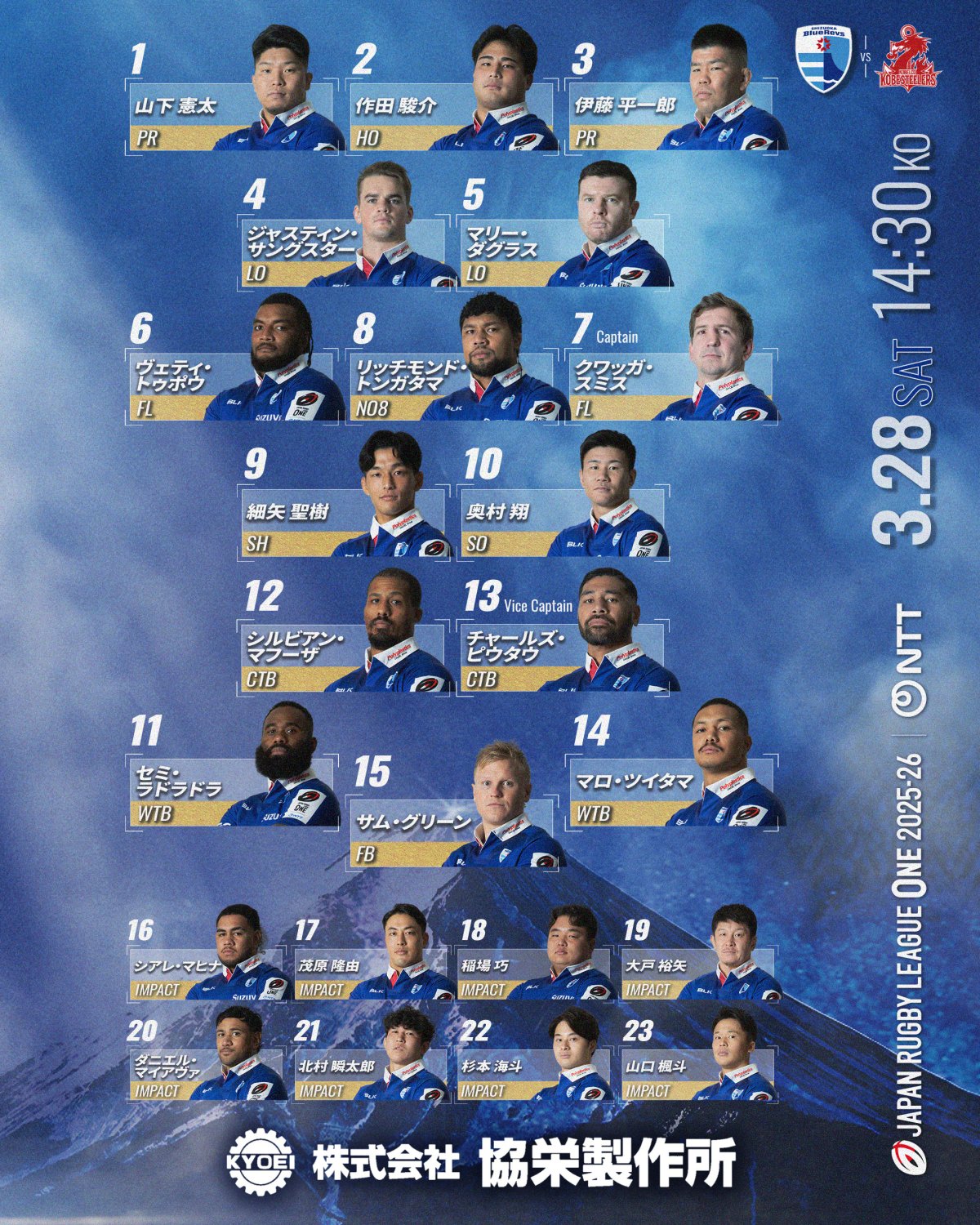 3/28 コベルコ神戸スティーラーズ戦は、日本軽金属グループ presents マッチデー様にマッチデーパートナーとしてサポートしていただき、「日本軽金属グループ presents マッチデー」として開催いたします。