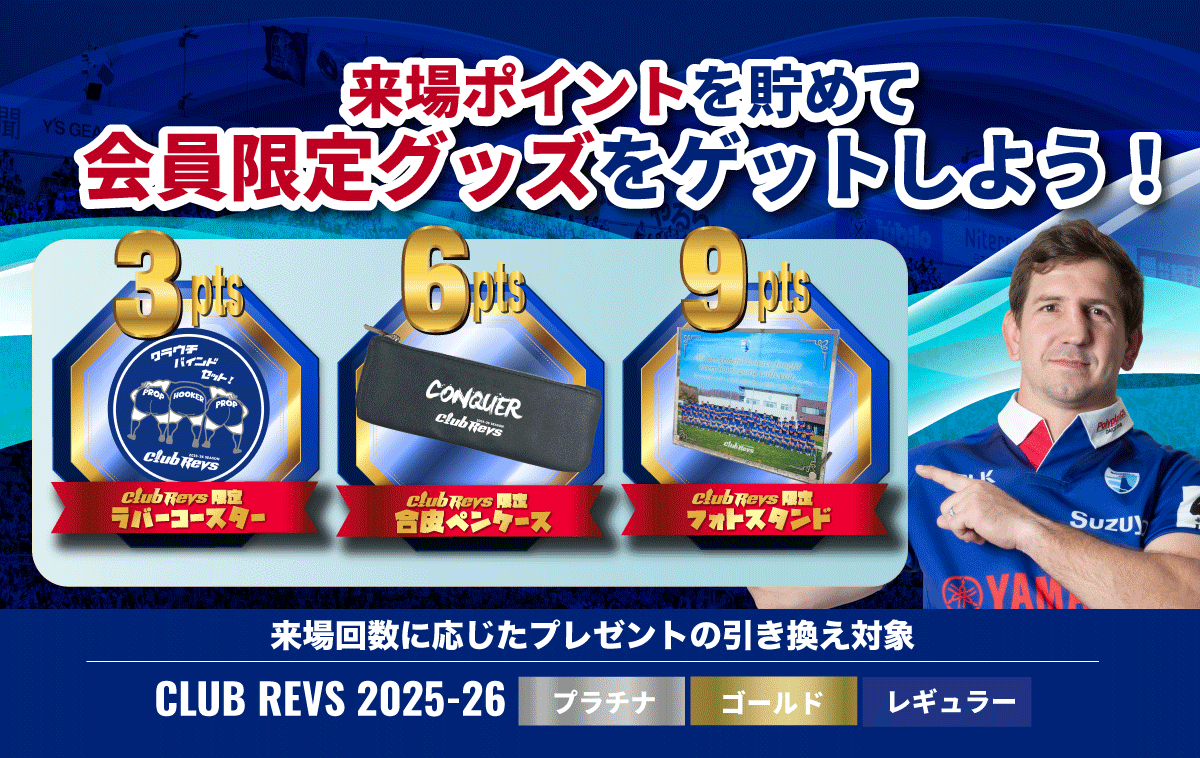 CLUB REVS 2025-26 プラチナ・ゴールド・レギュラー会員で、来場ポイントを3pts・6pts・9ptsと貯める度に限定グッズをプレゼント!