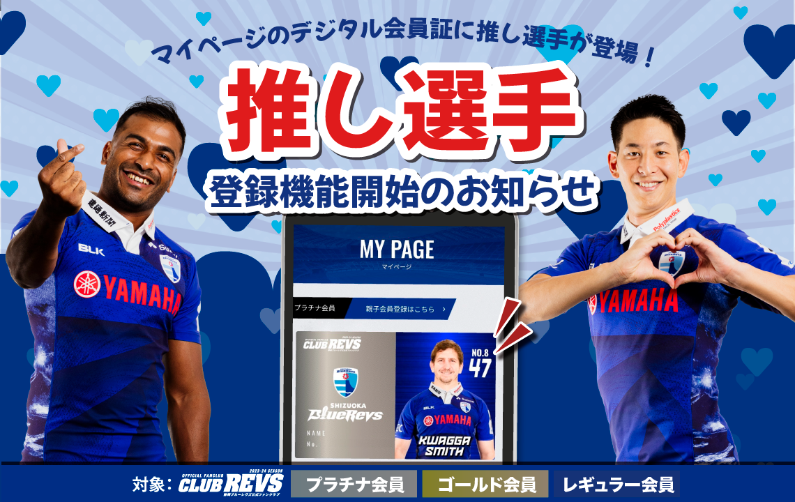 2023-24 静岡ブルーレヴズ公式ファンクラブ 『CLUB REVS』プラチナ・ゴールド・レギュラー会員の入会特典の1つである【推し選手登録機能】が12月8日(金)12:00からスタートいたしますので、ご利用方法をご案内いたします。