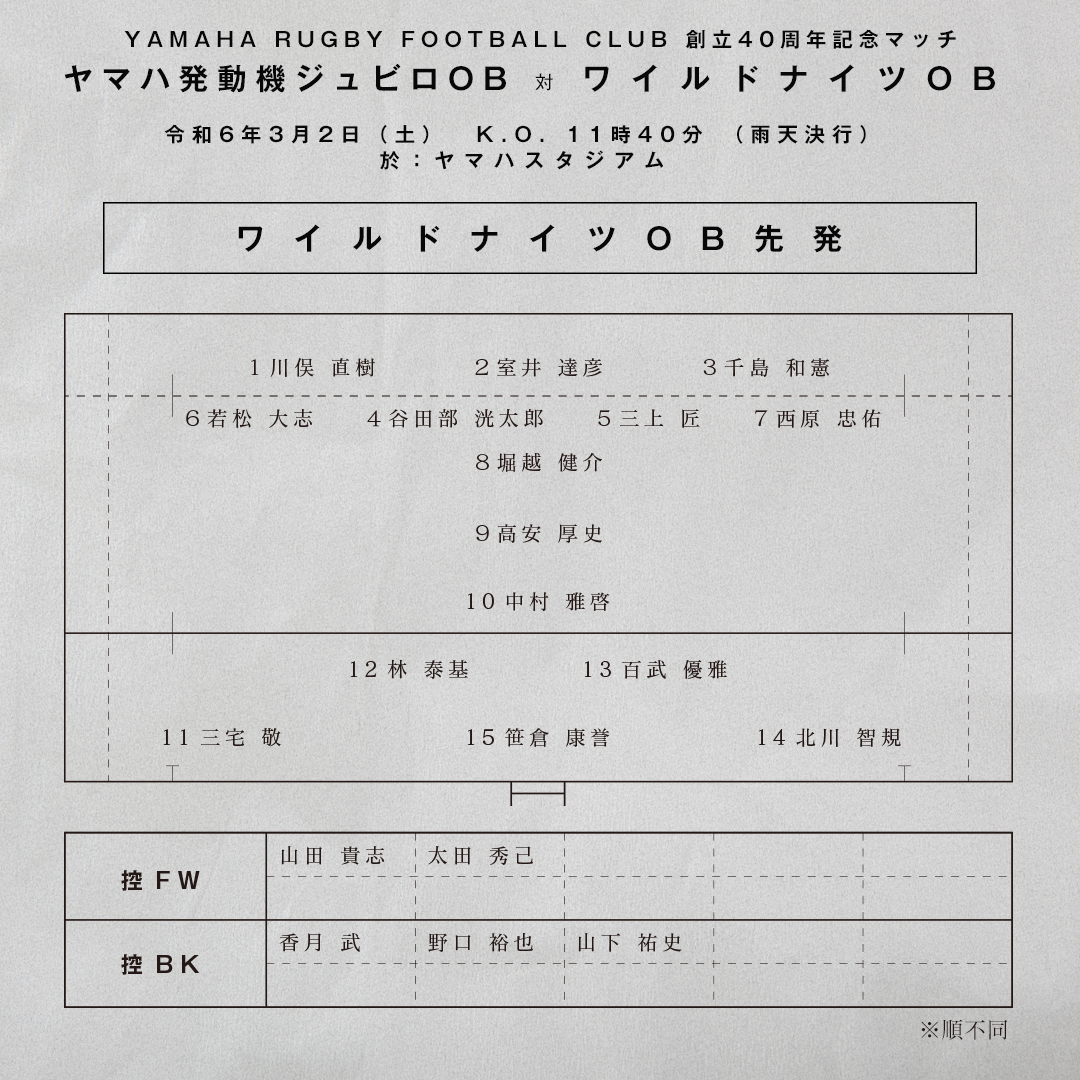 2024年3月2日(土)NTTジャパンラグビー リーグワン2023-24DIVISION 1(医)R&O presents ベルテックス静岡マッチデー 埼玉パナソニックワイルドナイツ戦(14:00キックオフ / ヤマハスタジアム)にて行われた「YAMAHA RUGBY FOOTBALL CLUB創立40周年記念マッチ supported by 株式会社ミクニ」ヤマハ発動機ジュビロOB 対 ワイルドナイツOB の試合結果をお知らせいたします。約4,000名のファンの皆様に現地でご観戦いただきました。