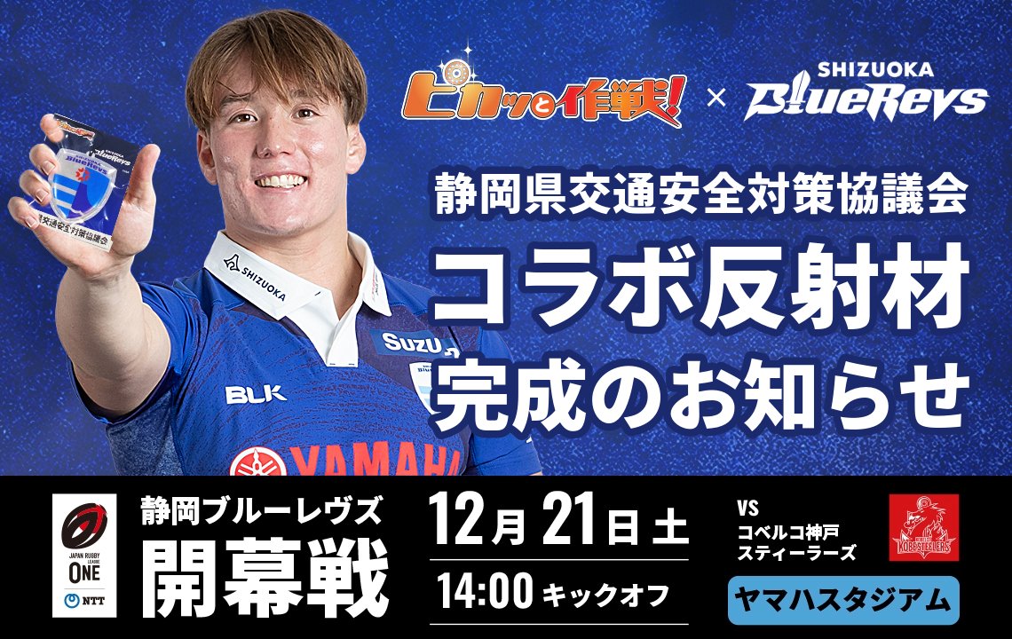 この反射材ストラップは、静岡県交通安全対策協議会(会長:静岡県知事)との協働で初めて製作し、12 月 21 日(土)の NTT ジャパンラグビー リーグワン 2024-25 DIVISION1 第 1 節 スター精密 presents マッチデー コベルコ神戸スティーラーズ戦では、ヤマハスアジアム内の静岡県くらし交通安全課ブースにて先着 2,500 名様に配布いたします。