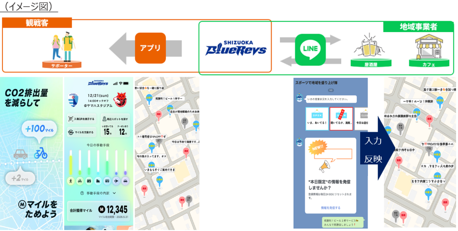 2024-25シーズンより、デジタルなどを活用した渋滞緩和や試合運営におけるCO₂排出量削減(※)に取組んでいるが、公共交通利用などで観戦客が獲得したポイントの利用シーンを多様化することで、これまで以上に利用しやすいソリューションを提供し、ファンと共にCO₂排出量の削減に一層取組みながら、駅前商店街の空洞化などの地域課題解決にも資すると考え、本公募への応募・採択に至っています。