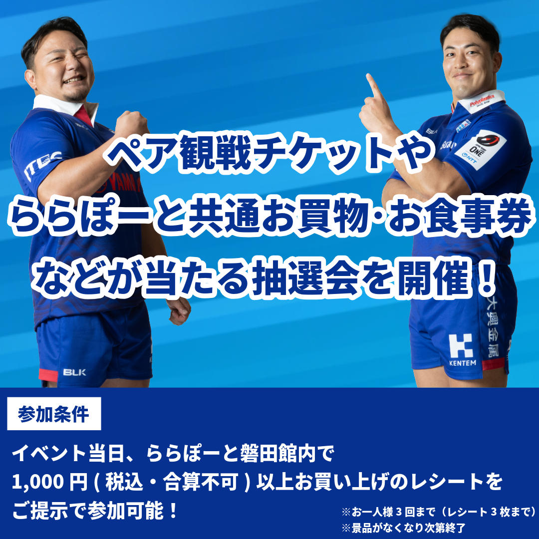 ホーム開幕戦のペア観戦チケットやららぽーと共通お買物・お食事券などが当たる抽選会を開催!イベント当日、ららぽーと磐田館内で1,000円(税込・合算不可)以上お買い上げのレシートをご提示で参加いただけます!