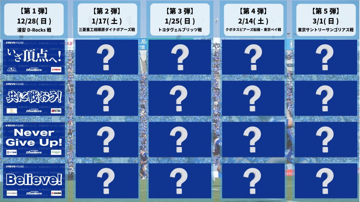 12月28日(日)の第2節から3月1日(日)の第10節までのホームゲーム5試合連続でそれぞれ4種類のメッセージが書かれたタオルが登場。タオルのデザインは毎試合変わるので全20種類。どれが手に入るかは当日のお楽しみ。