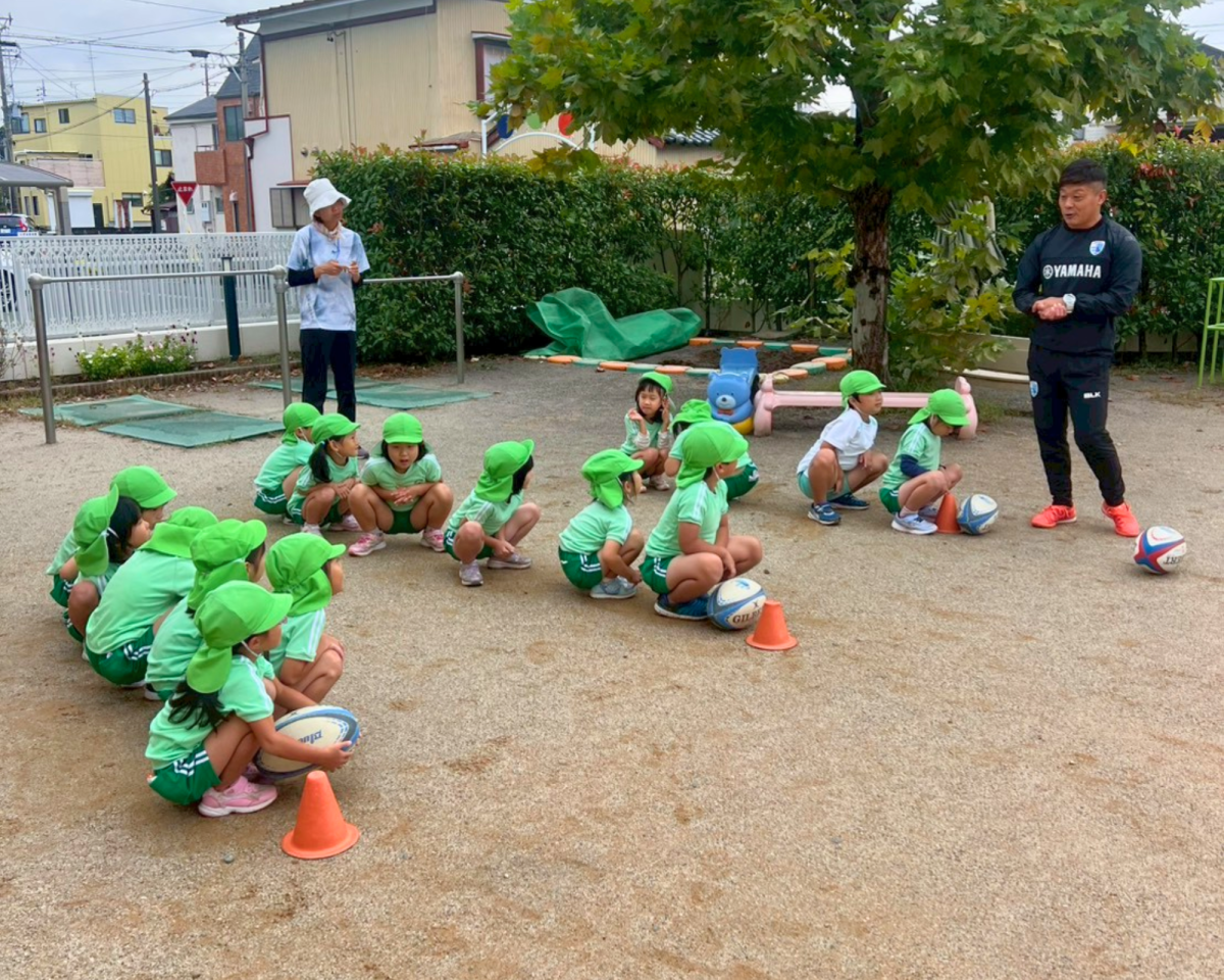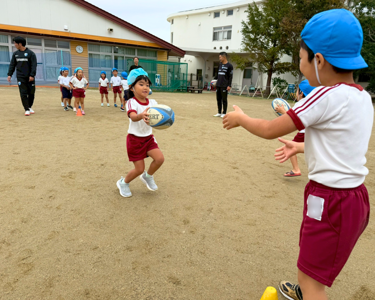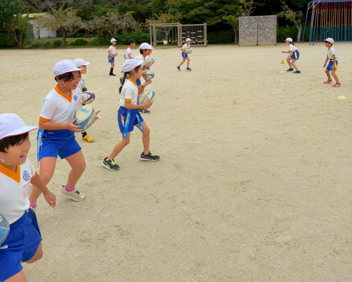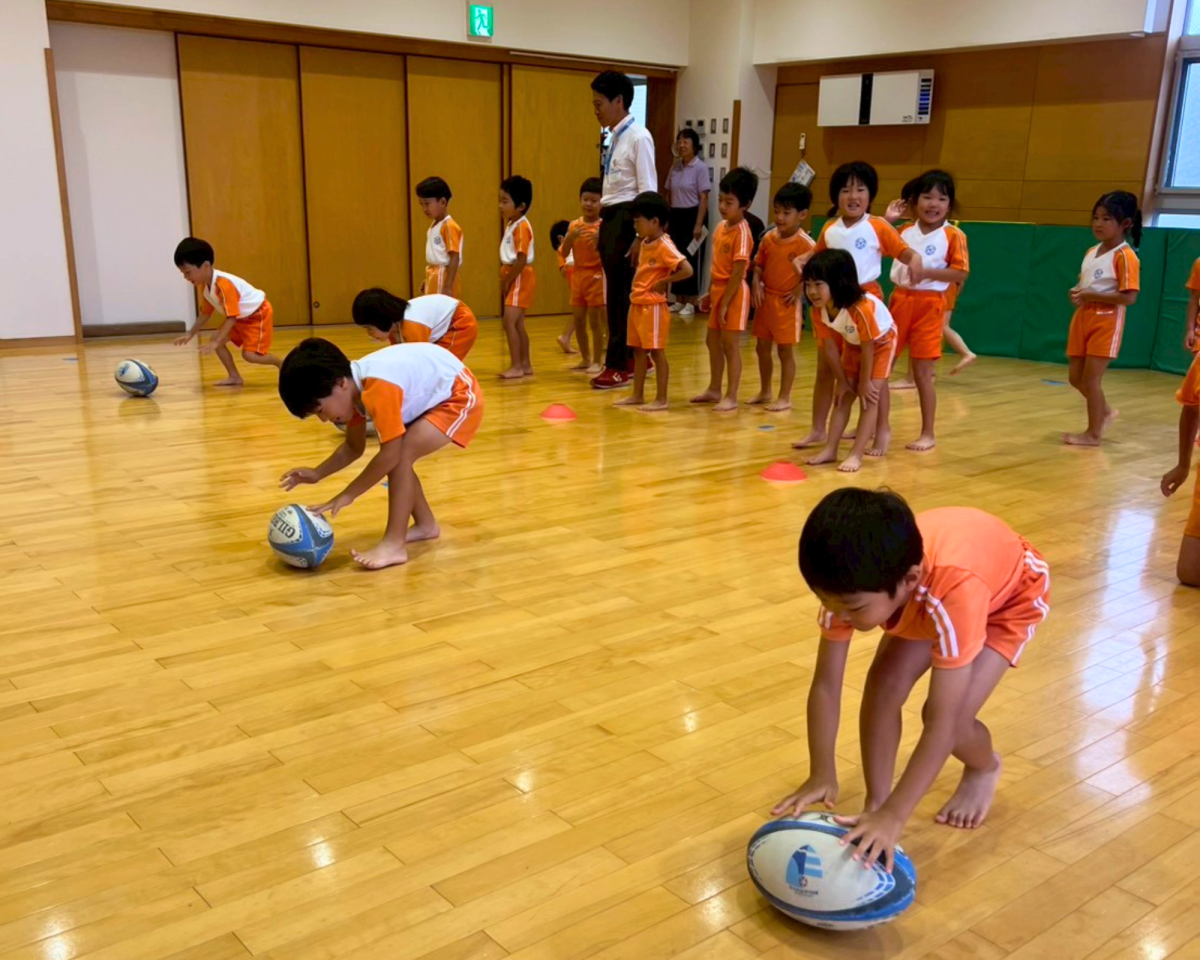 元気な挨拶から始まったラグビー体験では、たくさんのチャレンジができましたね!最後は伝説の「ふじさんゲーム」と「鬼ヶ島ゲーム」の夢のコラボ!!協力しながら勇敢に立ち向かうことができました!