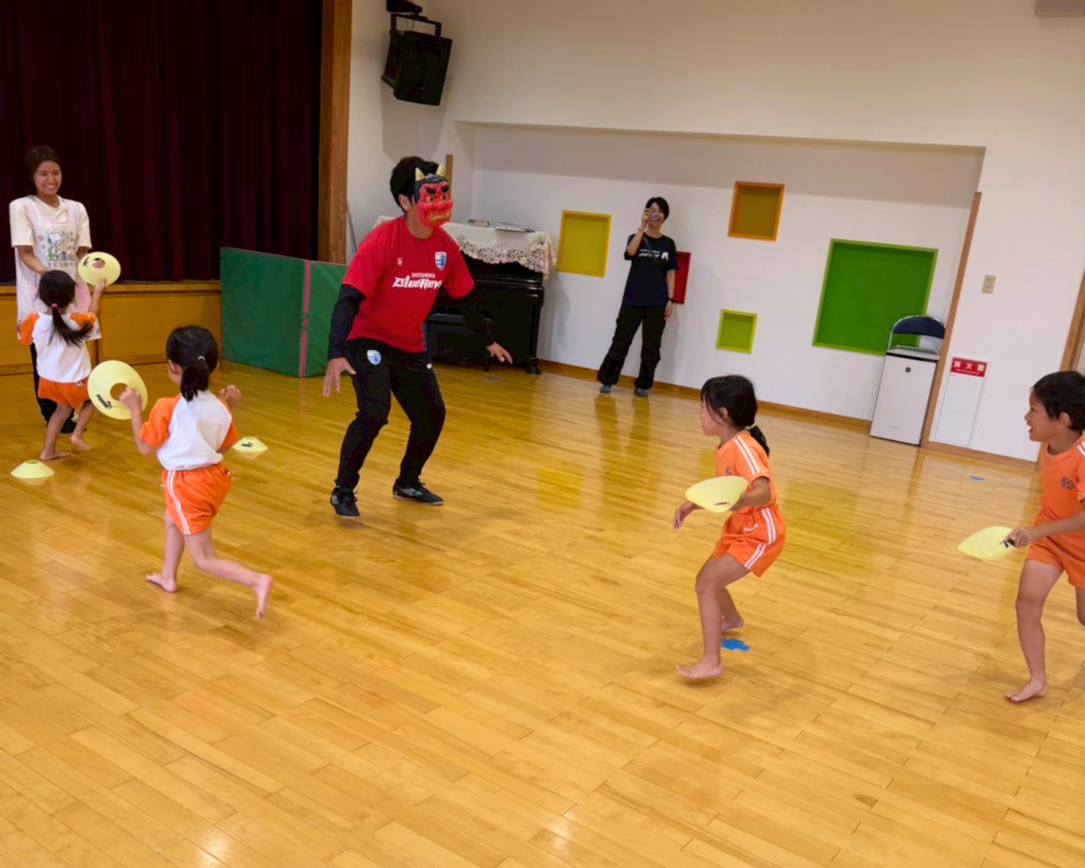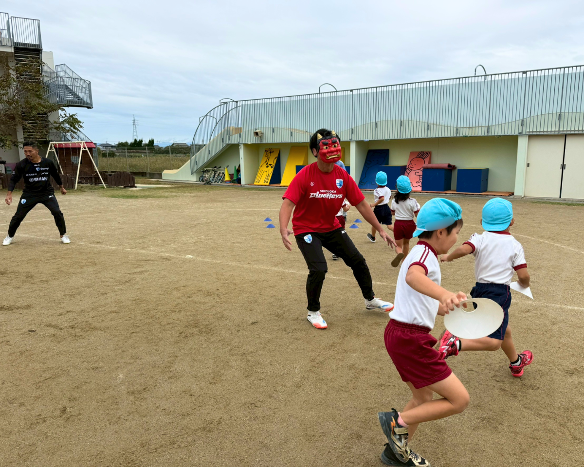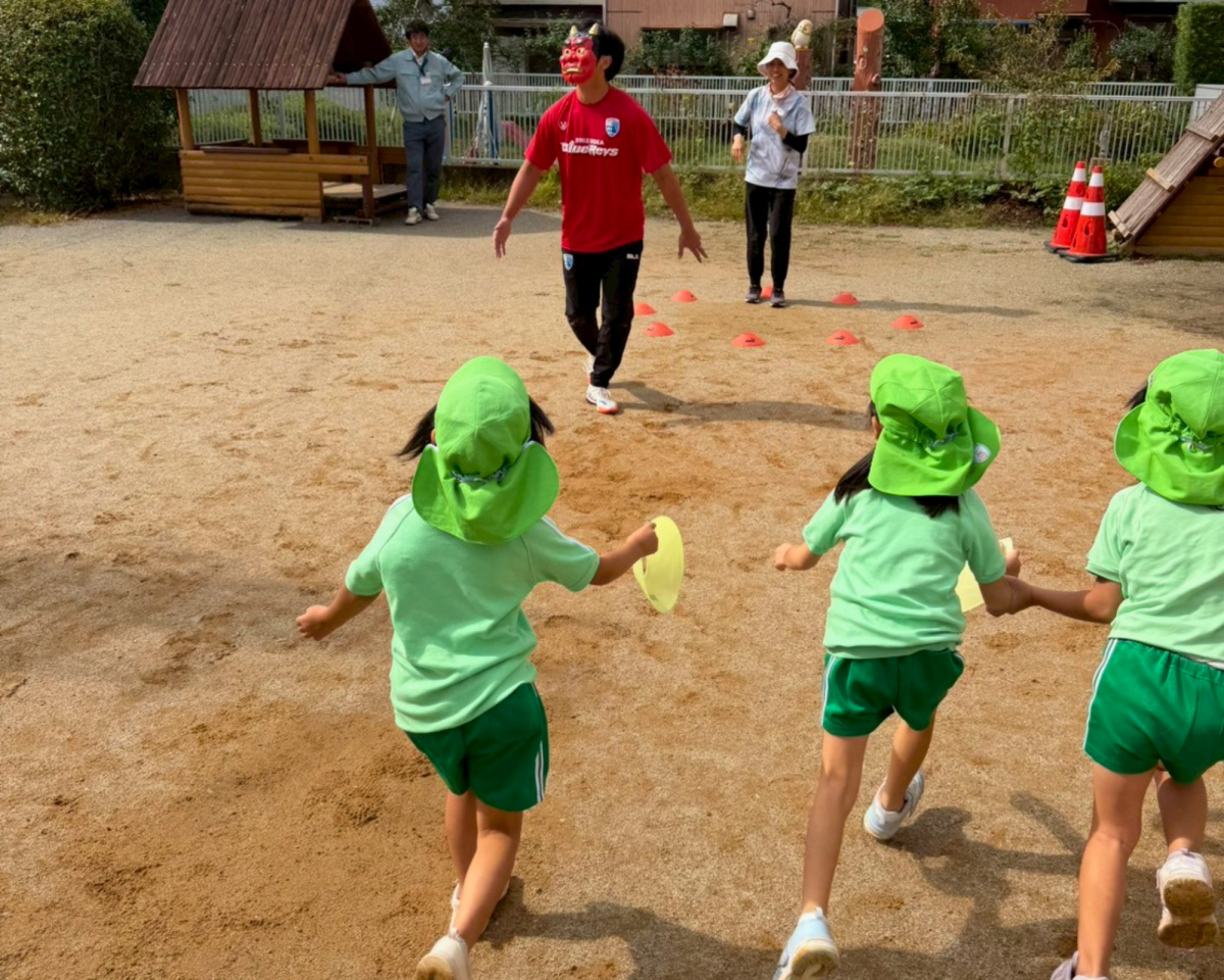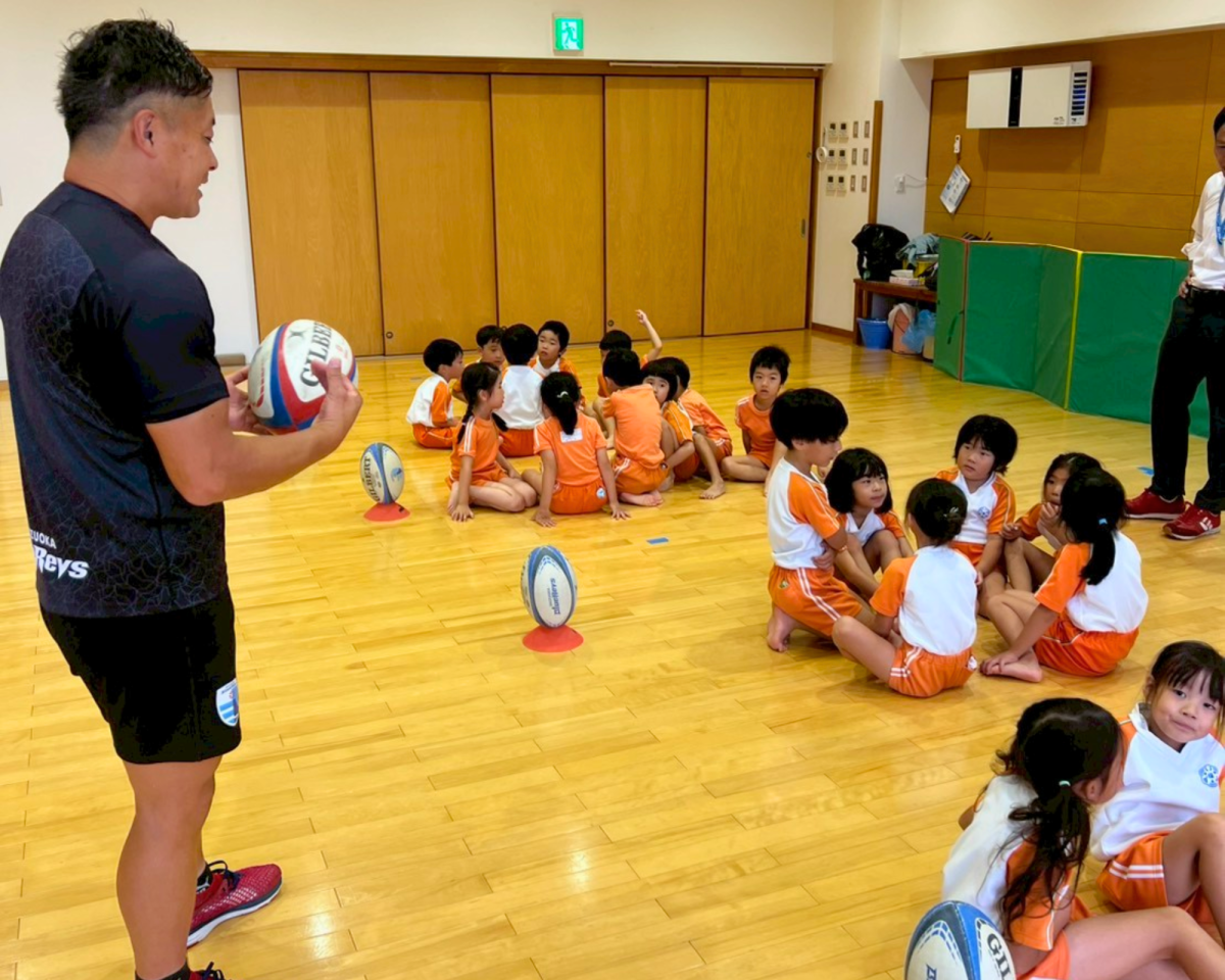 元気な挨拶から始まったラグビー体験では、たくさんのチャレンジができましたね!最後は伝説の「ふじさんゲーム」と「鬼ヶ島ゲーム」の夢のコラボ!!協力しながら勇敢に立ち向かうことができました!