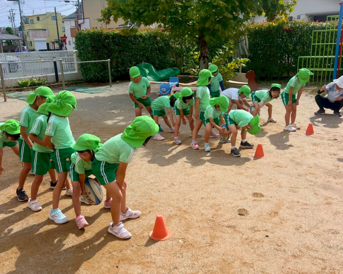 年長さん初めてのラグビー体験!なんとか晴れて外でラグビーにチャレンジできました。作成会議で上手にボールを運んだり、普段できないぶつかる体験ができて笑顔いっぱいでした!レヴズの応援来てねー!!また会おい!