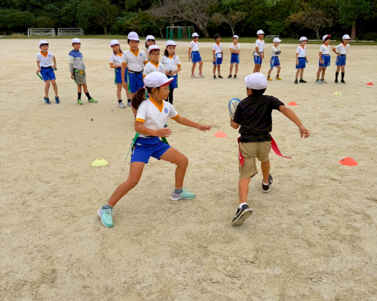 今回はゲーム形式のタグラグビーにチャレンジ!"思いやり"をテーマに抜群のチームワークで、素晴らしい攻防が見られました!体育のタグラグビーでも今日の成果を発揮してください!!