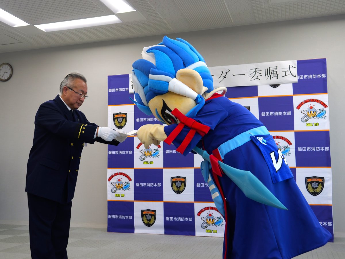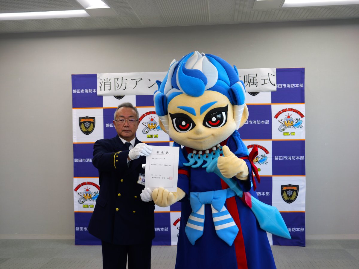 11月6日(木)に磐田市消防本部で行われた委嘱状交付式には、ジュビロくんとジュビィちゃん(ジュビロ磐田)、石田 小桜選手(静岡SSUボニータ)、レヴズくんが出席しました。髙尾消防長は「皆さんのスポーツの力を活用した市民への安全安心の啓発にご協力をお願いします」と話し、クラブを代表してレヴズくんが髙尾消防長から委嘱状を受け取りました。