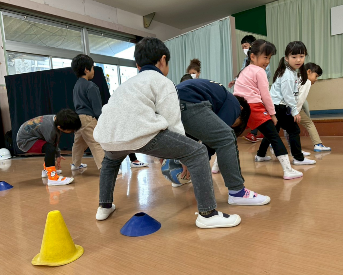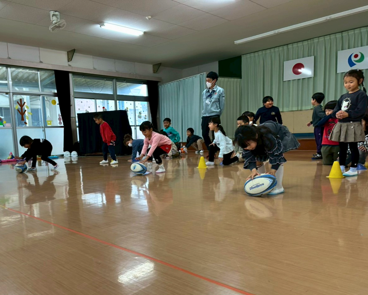 遊戯室での活動でしたが伸び伸びとラグビー体験ができました!仲間と力を合わせて最後のふじさんゲームも頑張りました!またスタジアムで待っとるでね!