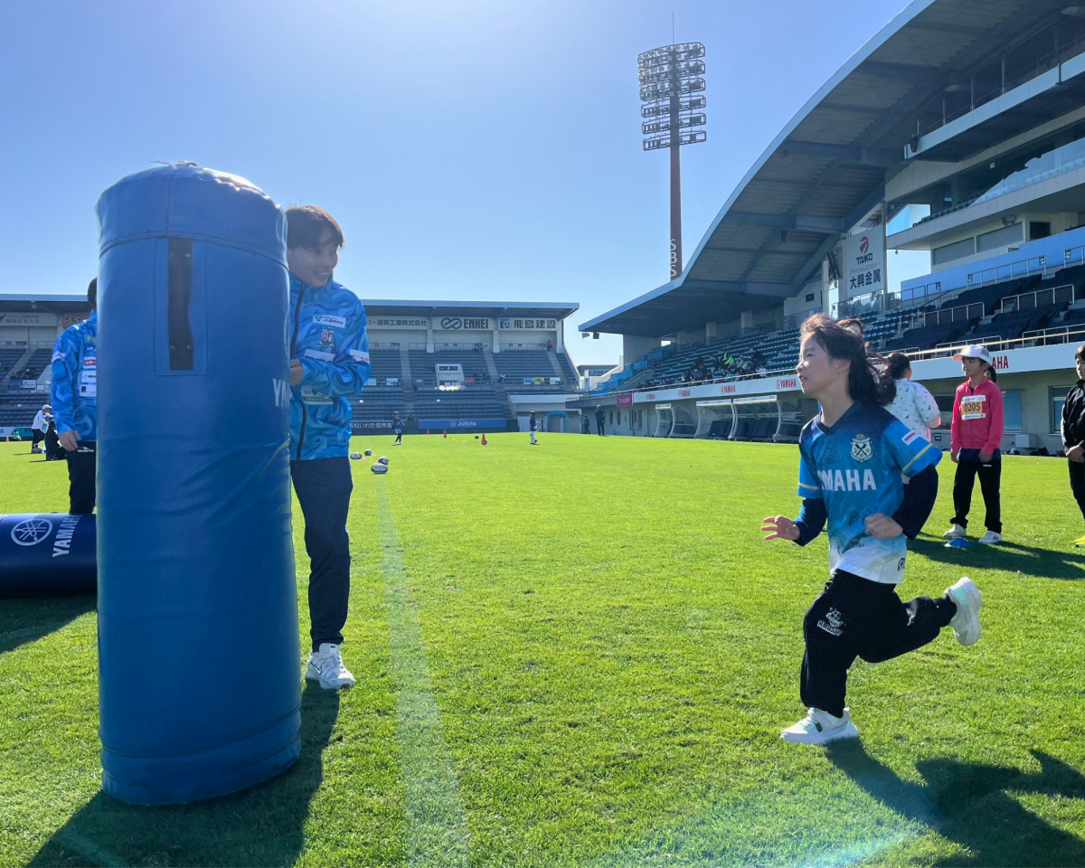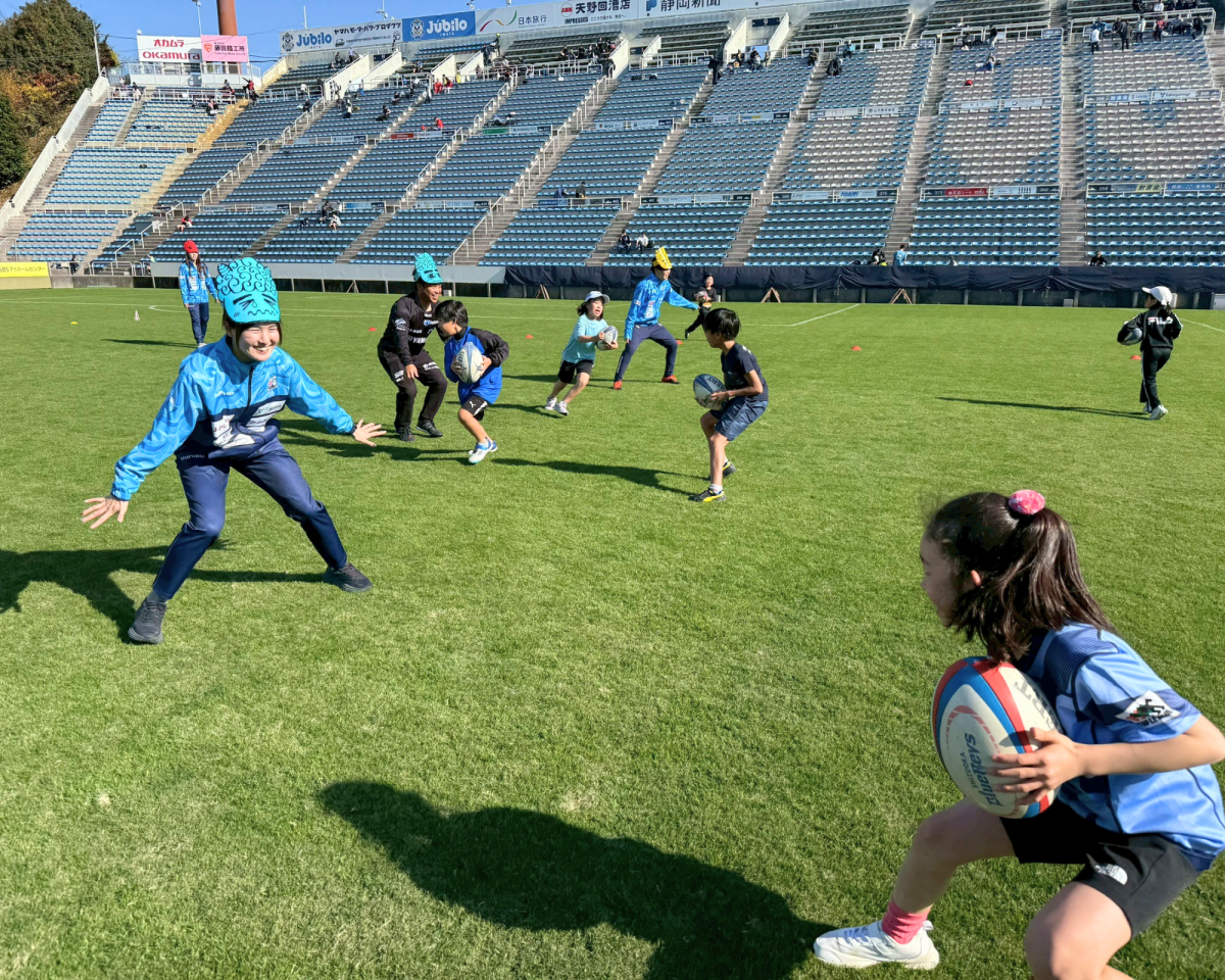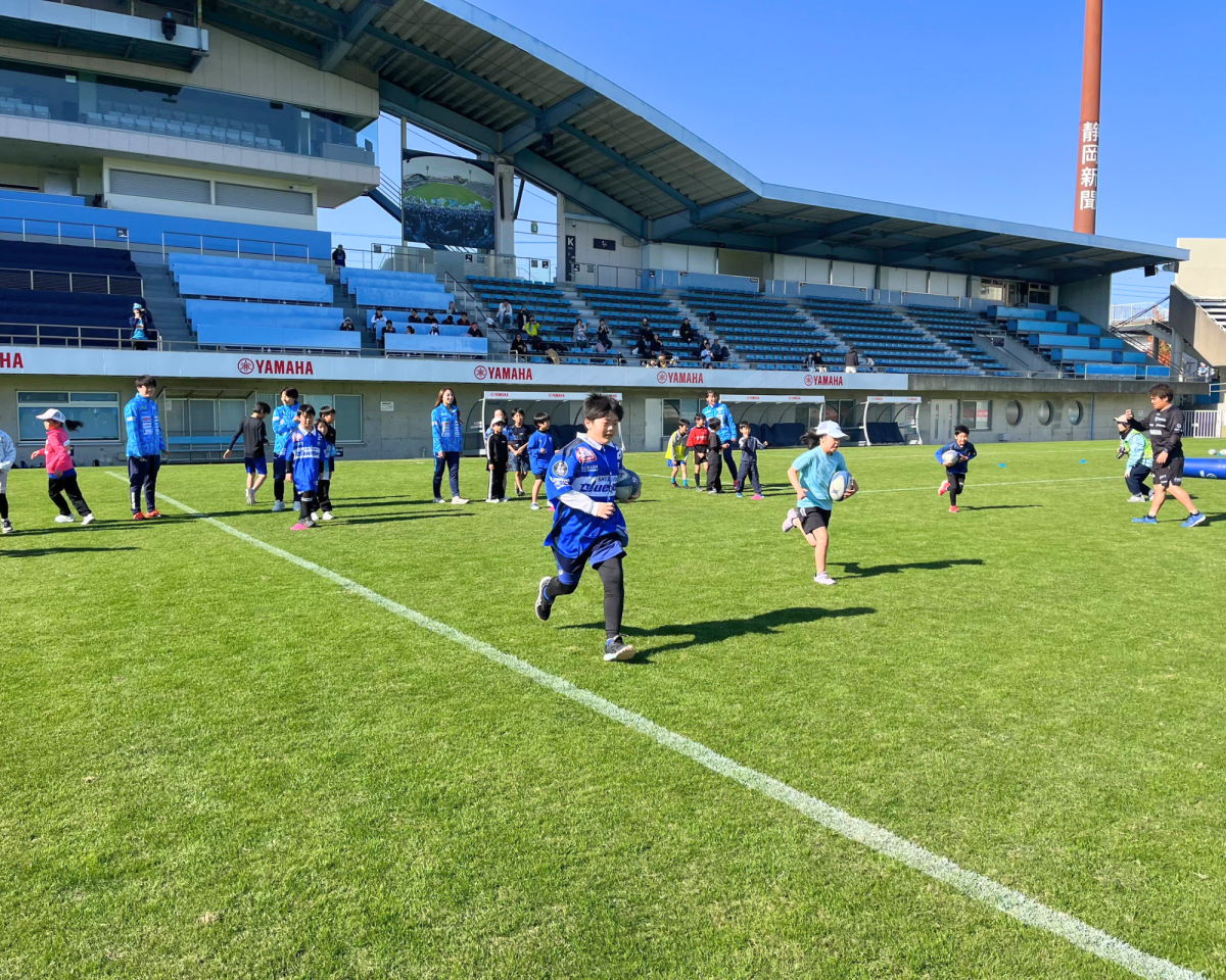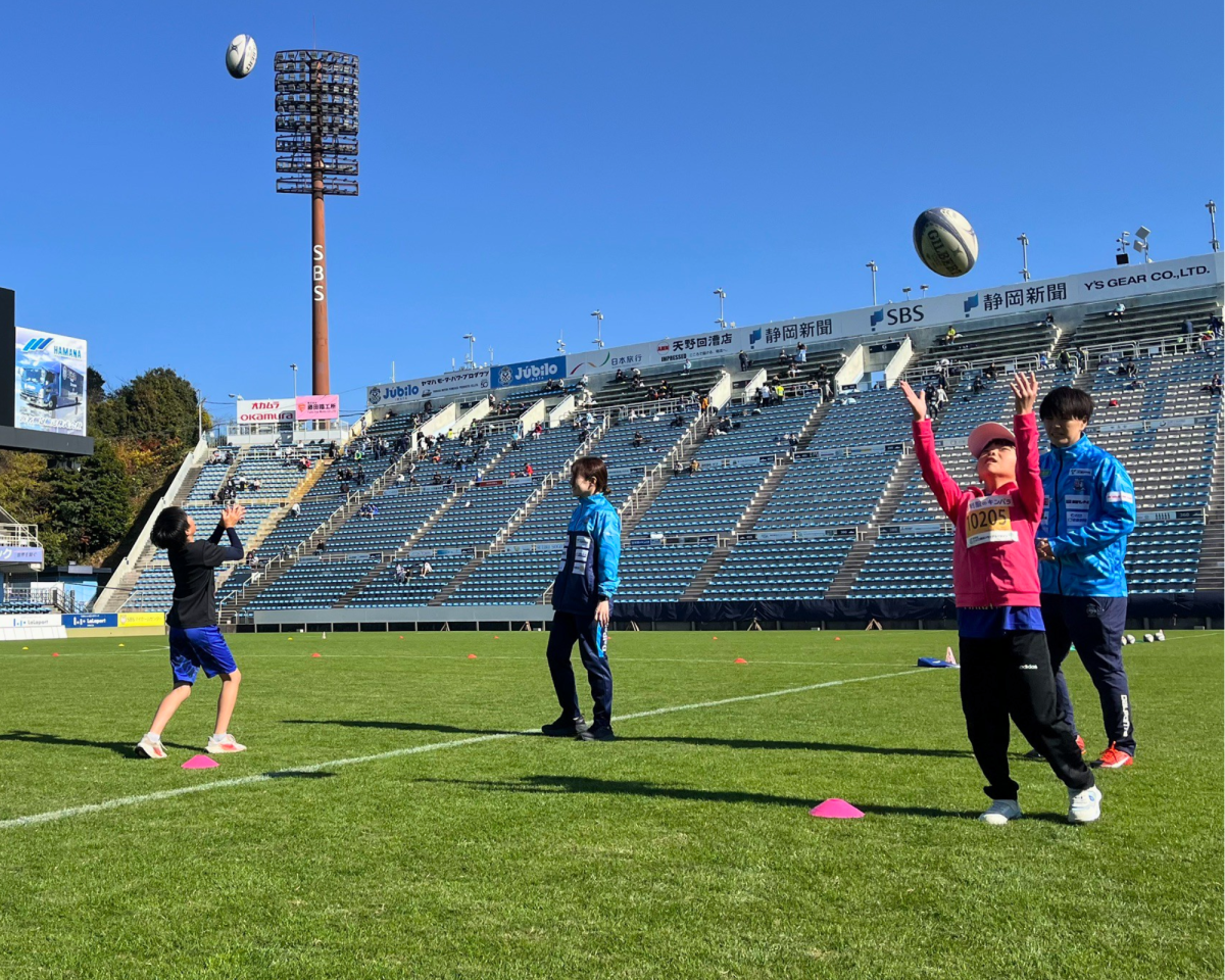 快晴の青空の中、ヤマハスタジアムのグラウンドを目一杯使って、ラグビークリニックを実施しました。青々とした芝生の上をラグビーボールを使ってリレーやコンタクト体験で走り回る子ども達の笑顔が溢れる時間となりました!ボニータの選手にもアツいサポートをいただき、最後の鬼ごっこは大盛況!「もう終わり?まだまだやりたい!」と嬉しいお言葉をたくさんいただけました。このような機会をいただきましたイベント関係者の皆さま、参加いただいた皆さま、静岡SSUボニータの皆さまに改めてお礼申し上げます。