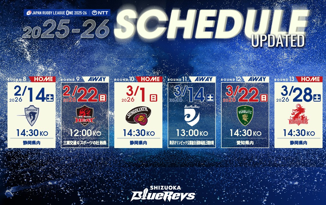 第8・10・13節は静岡県内でのホームゲーム!!第8節は昨季準優勝のクボタスピアーズ船橋・東京ベイを迎え14:30にキックオフ。第10節・13節は昨季のリベンジマッチ!東京サントリーサンゴリアスとコベルコ神戸スティーラーズ戦も、共に14:30キックオフ!