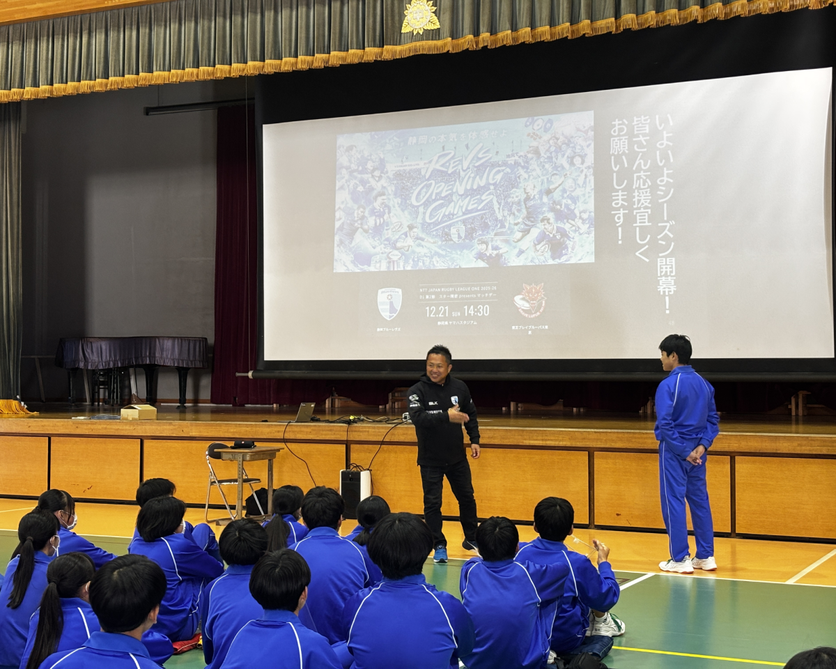 講座の最後には、この日も応援練習「GO!GO!REVS!!」 「GO!GO!REVS!!!」 「GO!GO!REVS!!!!」を実施。