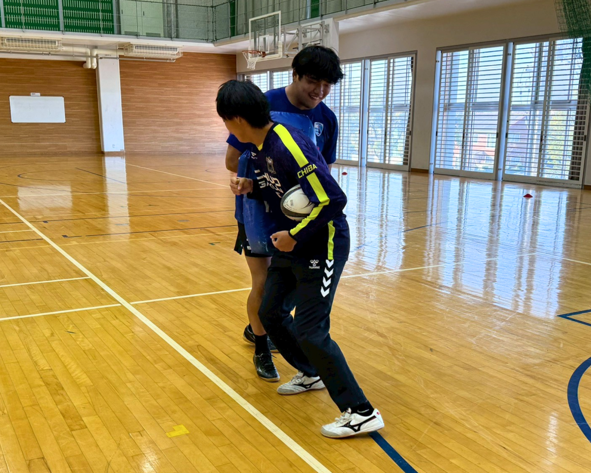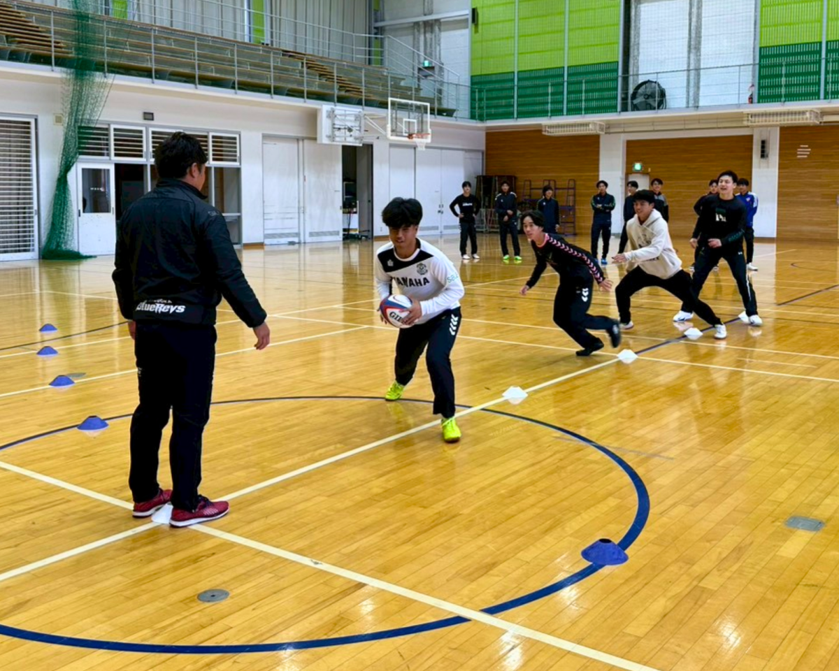 静岡ブルーレヴズでは、産学連携協定を締結する静岡産業大学において、静岡ブルーレヴズのラグビー普及スタッフによる出張ラグビー授業を実施いたしました。11月28日、12月5日の2回にわたり、同大学キャンパス内の体育館で行われた出張ラグビー授業には、スポーツ科学部の学生32名が参加。県内でのラグビー普及という目的に加え、保険体育科教員やスポーツクラブ等への進路希望者も多い静岡産業大学の学生がプロフェッショナルのコーチングを体験する機会として開催しました。ニュースポーツを主な題材として扱うスポーツ実技授業であるスポーツ B(担当:木村駿介講師)で、学生たちにラグビーの魅力を直接伝える貴重な機会となりました。