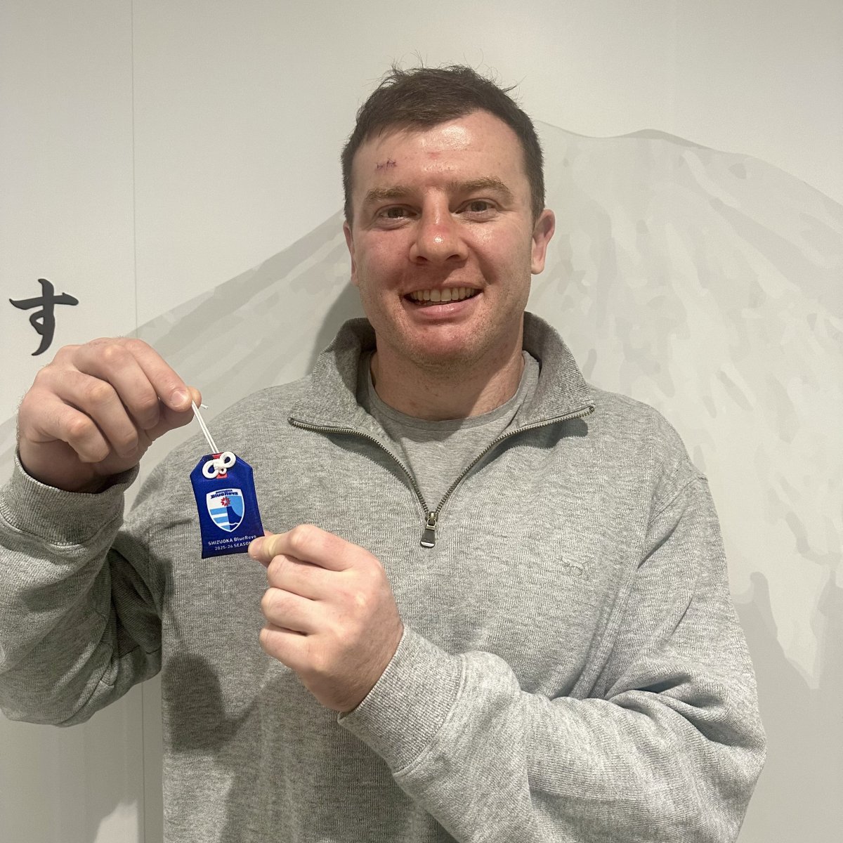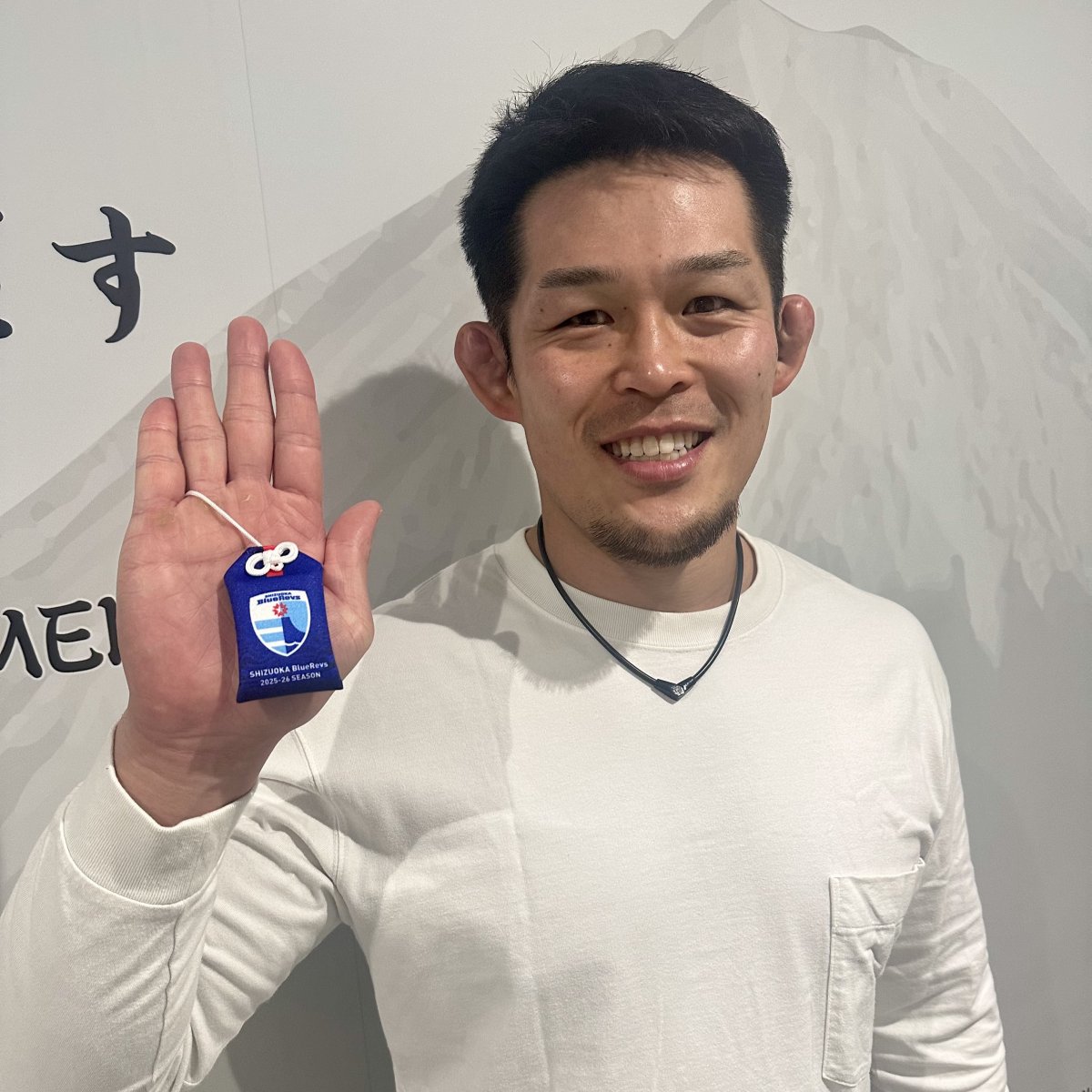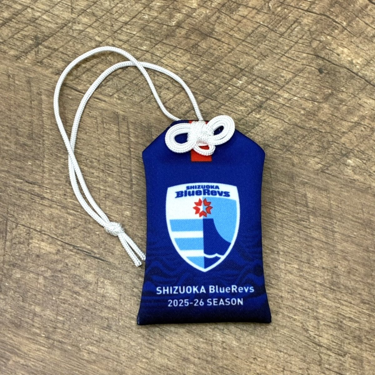 静岡ブルーレヴズオリジナルデザインのお守りで、表面にはエンブレム、裏面には<勝守>の文字が描かれています。背景の柄は2025-26シーズン 1stジャージをイメージし、さらに、巾着の中には 藤井雄一郎監督のメッセージ『一丸となって日本一へ』が封入されています。