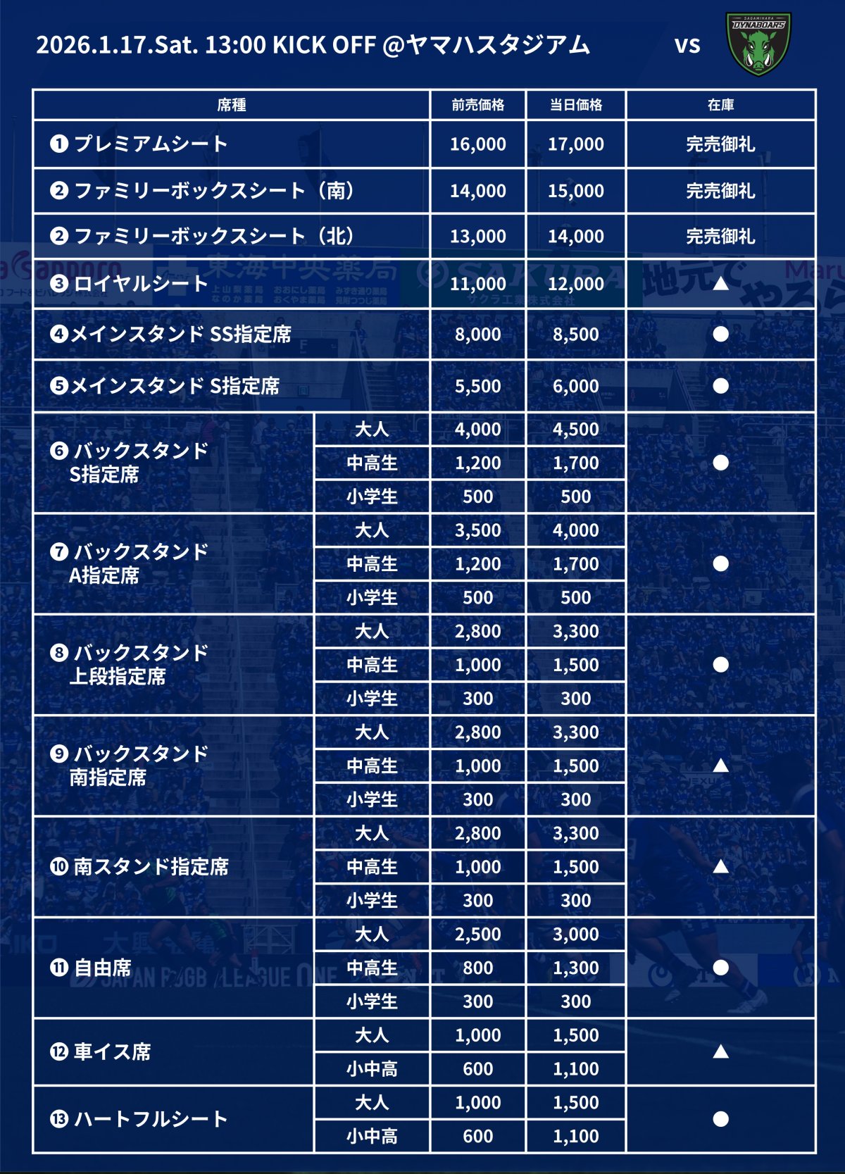 1月17日(土)のNTTジャパンラグビー リーグワン2025-26 DIVISION 1 第5節 三菱重工相模原ダイナボアーズ戦(13:00キックオフ/ヤマハスタジアム)における当日券の販売についてお知らせいたします。