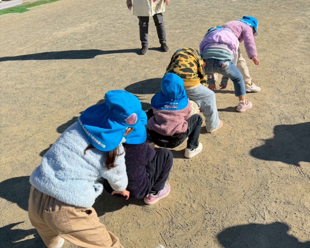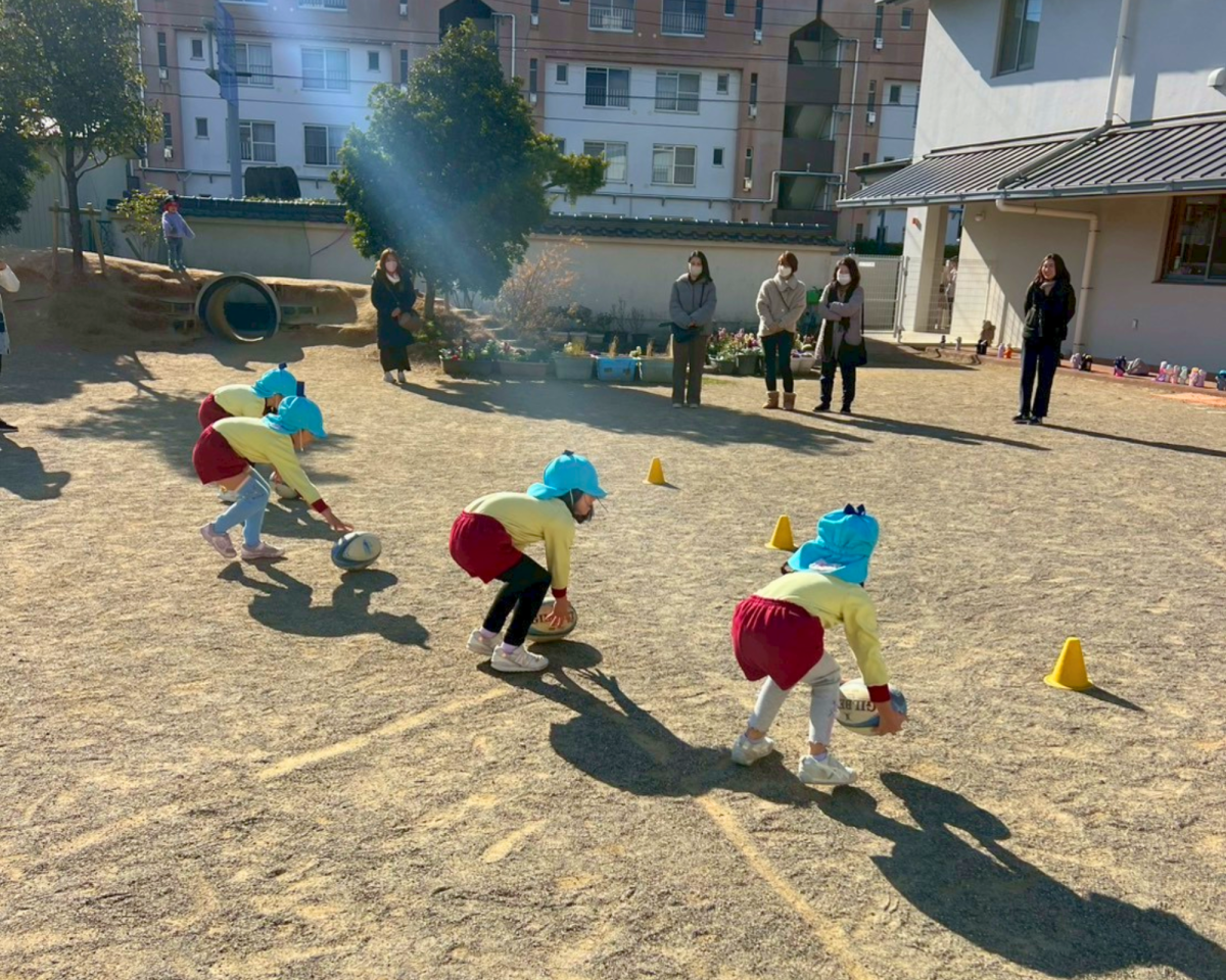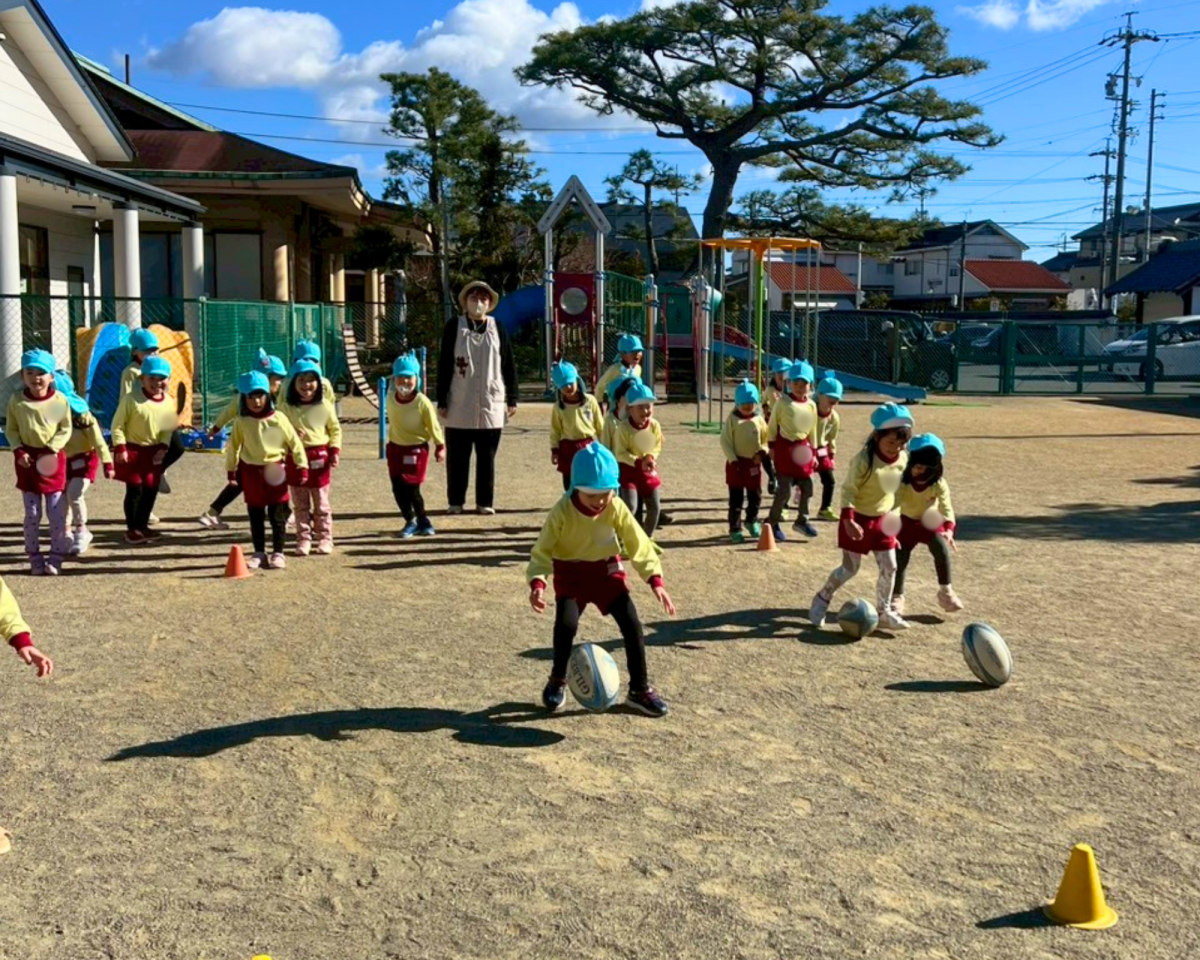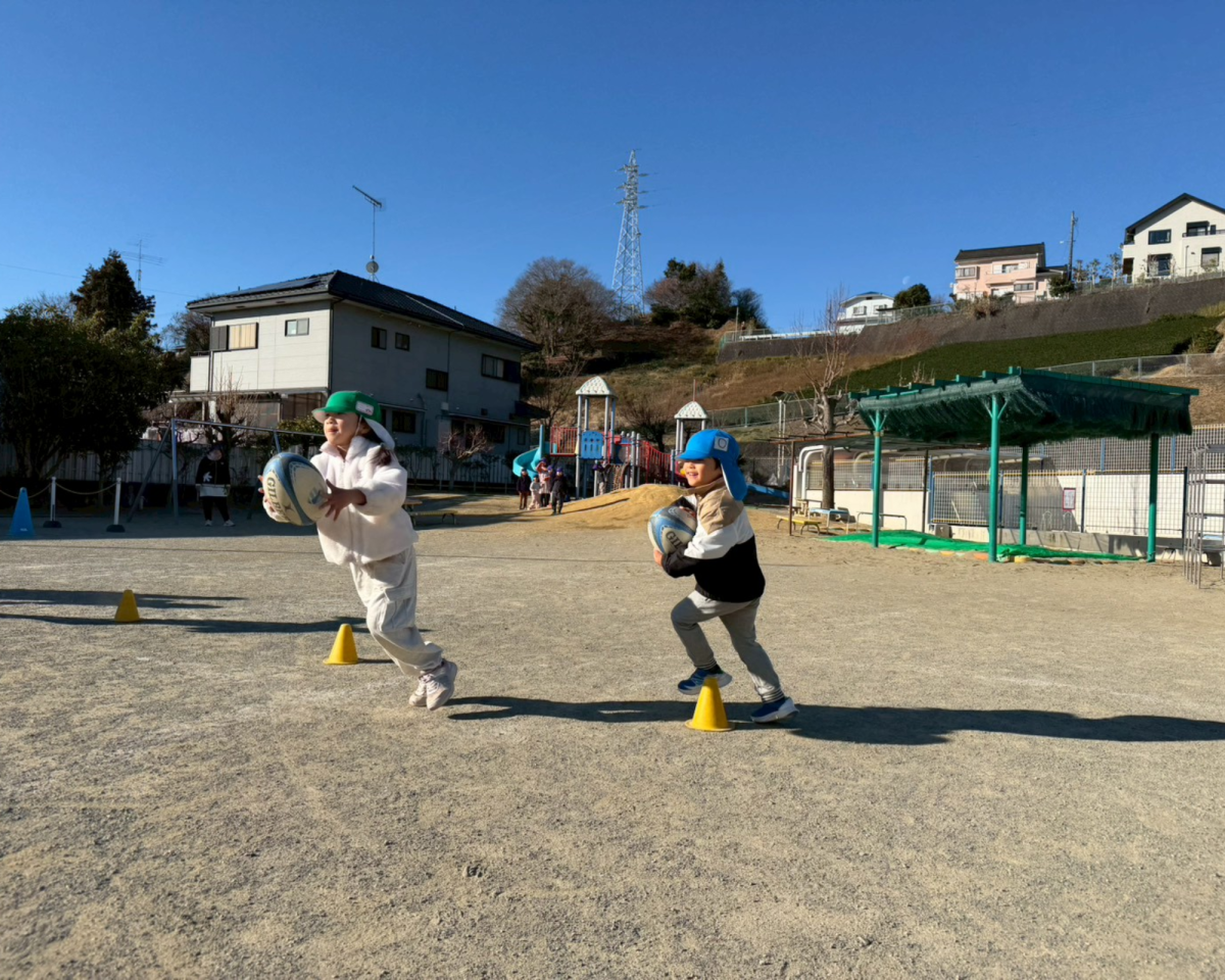 初めてのラグビー体験!青空の下、風にも負けずみんな元気いっぱい走り回りました!ラグビーボールを使ってキャッチやドリブル、みんなと協力してたくさんのことにチャレンジできました!