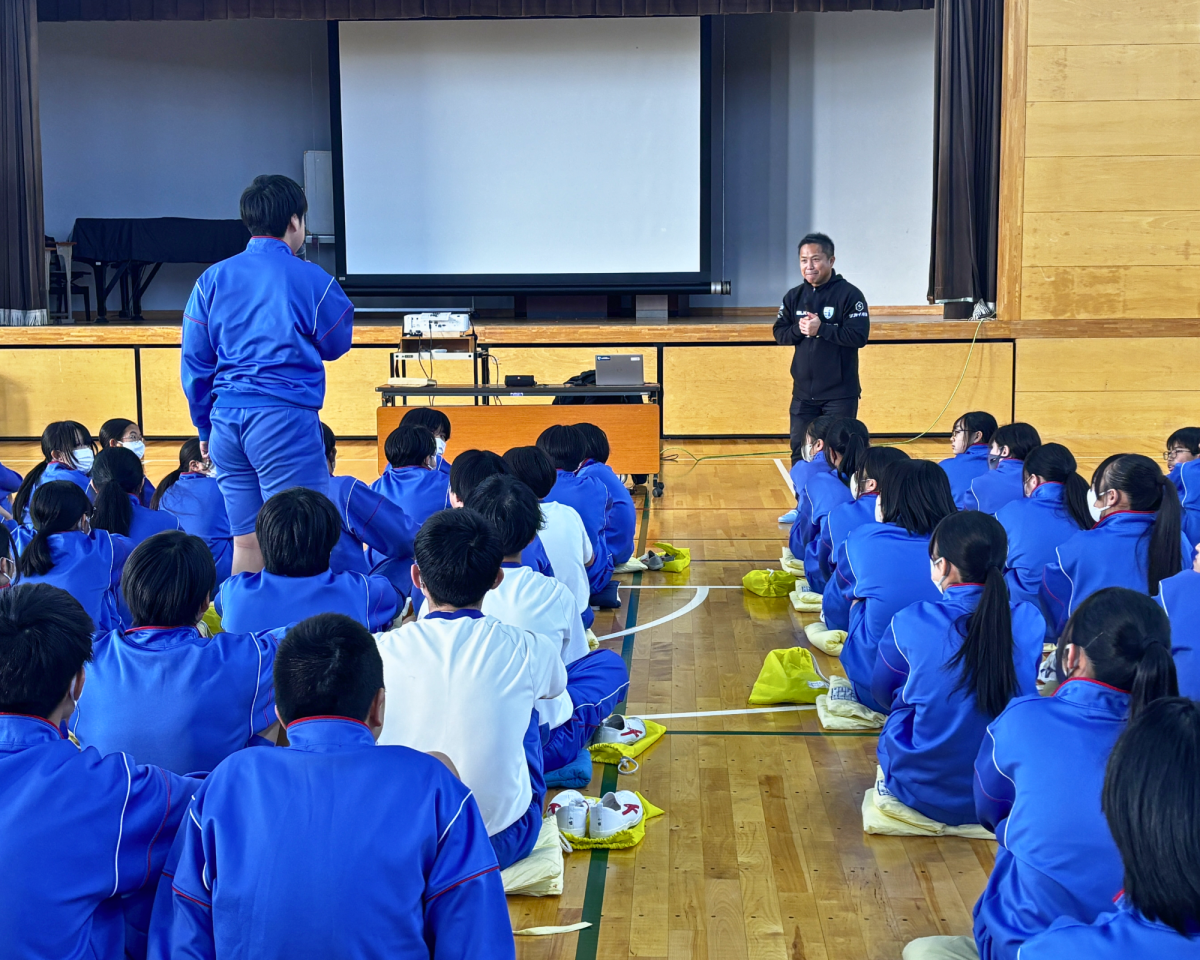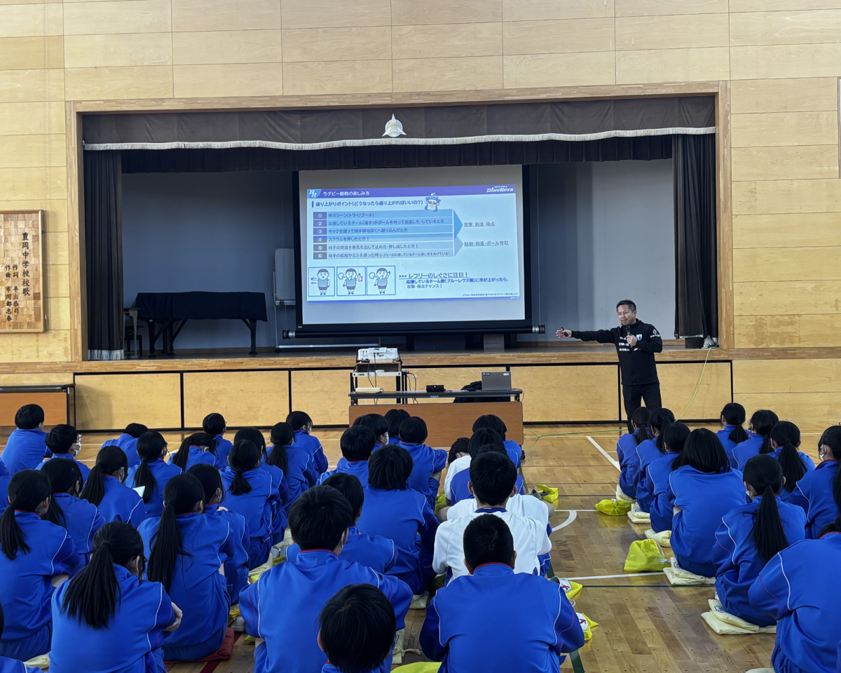 1月9日(金)に磐田市立南部中学校および豊岡中学校の2年生を対象にしたラグビー講座を実施、講師として育成普及担当の田井中が参加しました。