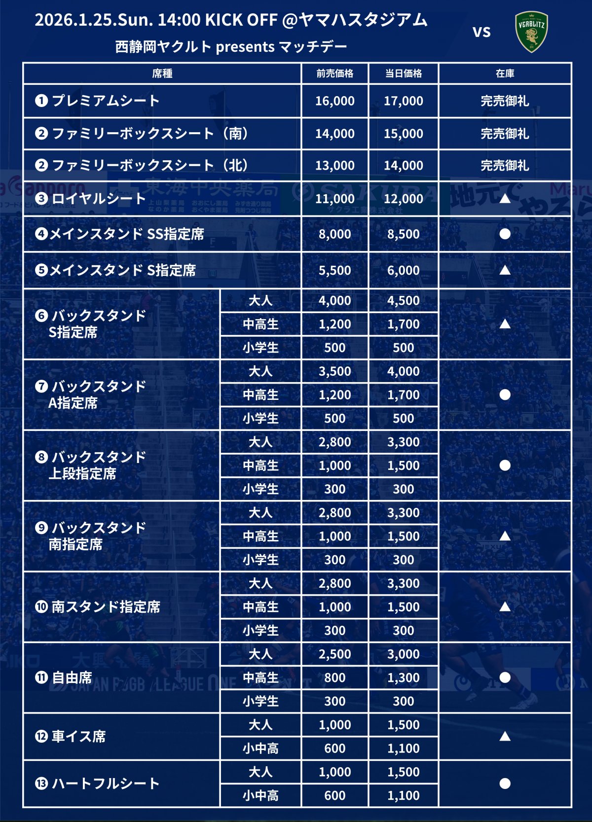 1月25日(日)のNTTジャパンラグビー リーグワン2025-26 DIVISION 1 第6節トヨタヴェルブリッツ戦(14:00キックオフ/ヤマハスタジアム)における当日券の販売についてお知らせいたします。