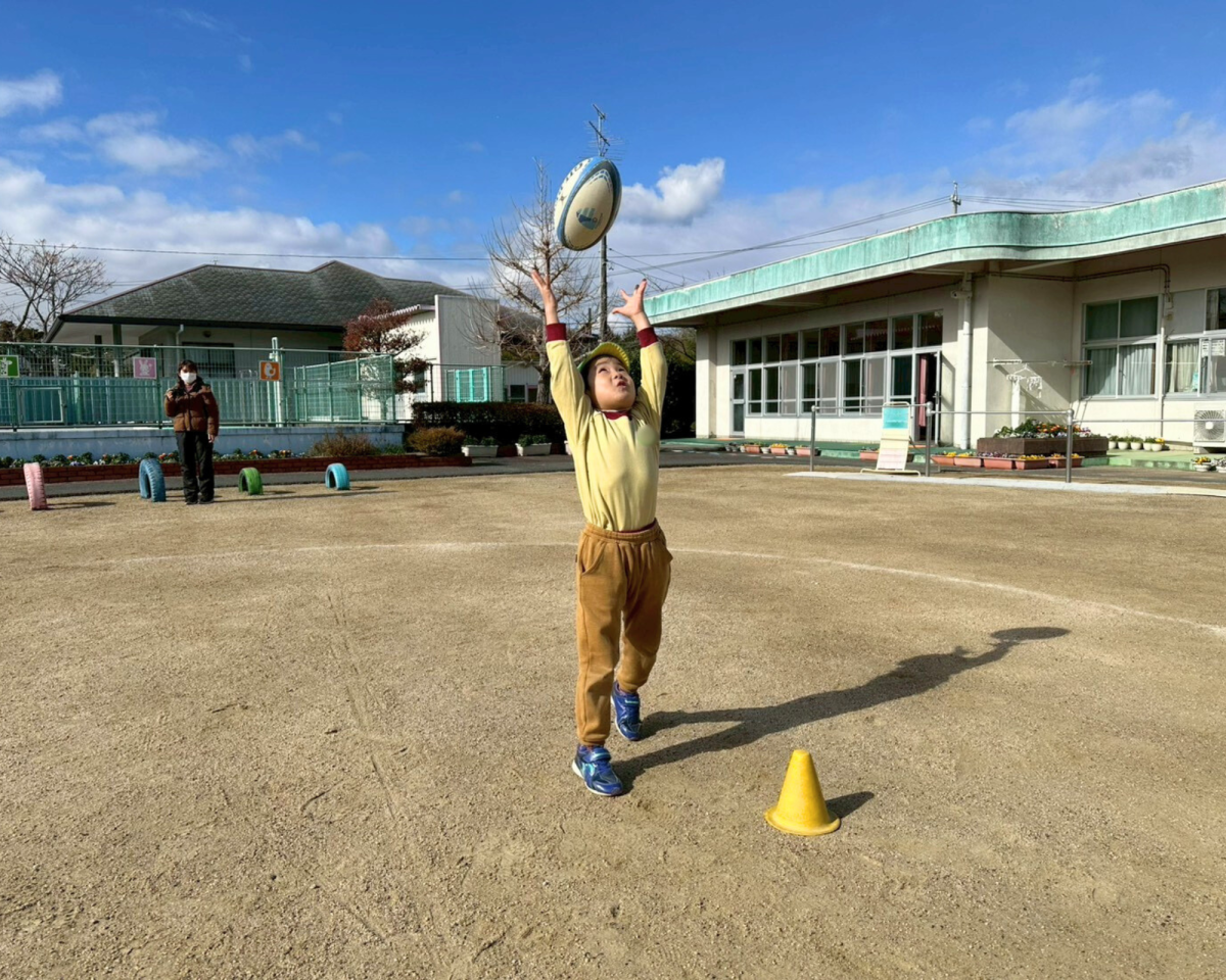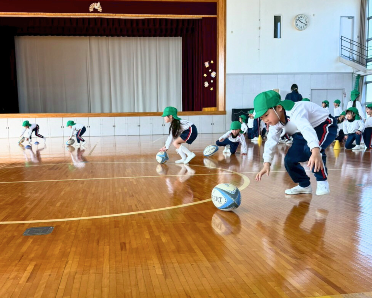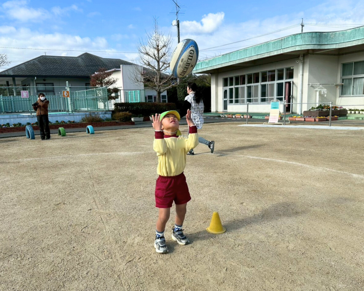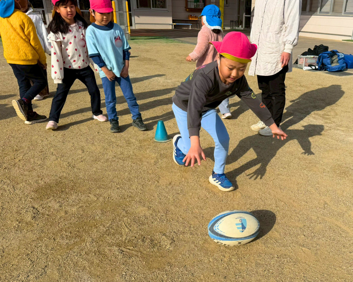 始まる前からラグビーボールに興味津々!手で転がしたり足でドリブルしたりも上手にできたね!!最後のゲームもたくさんトライもできました!