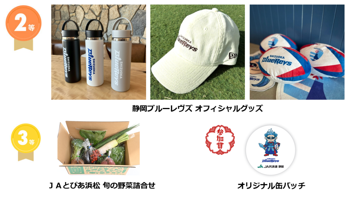 「聞かせて!くらしのこと アンケートキャンペーン」に回答いただき、応募完了画面または応募完了メールをブースにてご提示ください。ご参加いただいた方には、静岡ブルーレヴズオフィシャルグッズや静岡県特産品が当たる豪華抽選会にご参加いただけます。