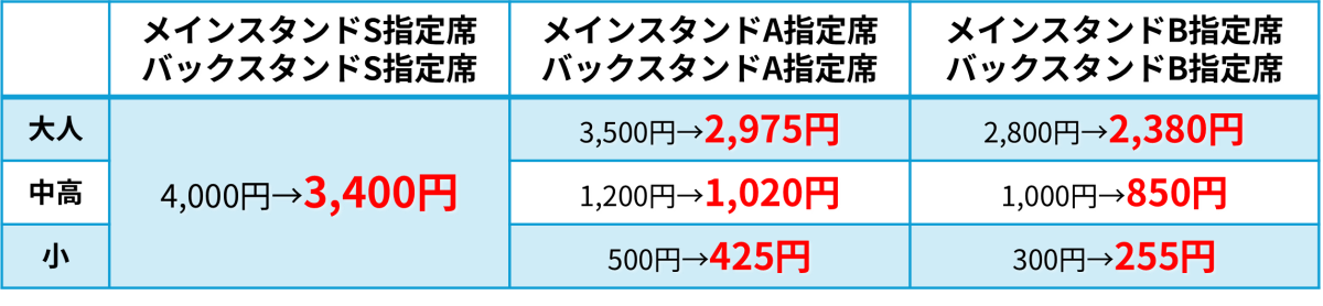※試合によってはご希望の席種がご用意できない場合がございますので、予めご了承ください