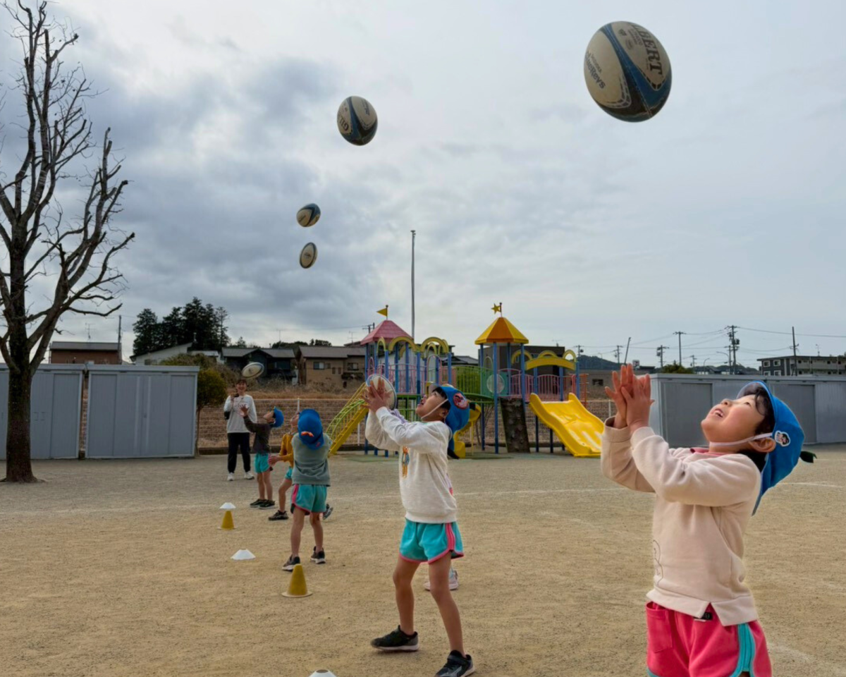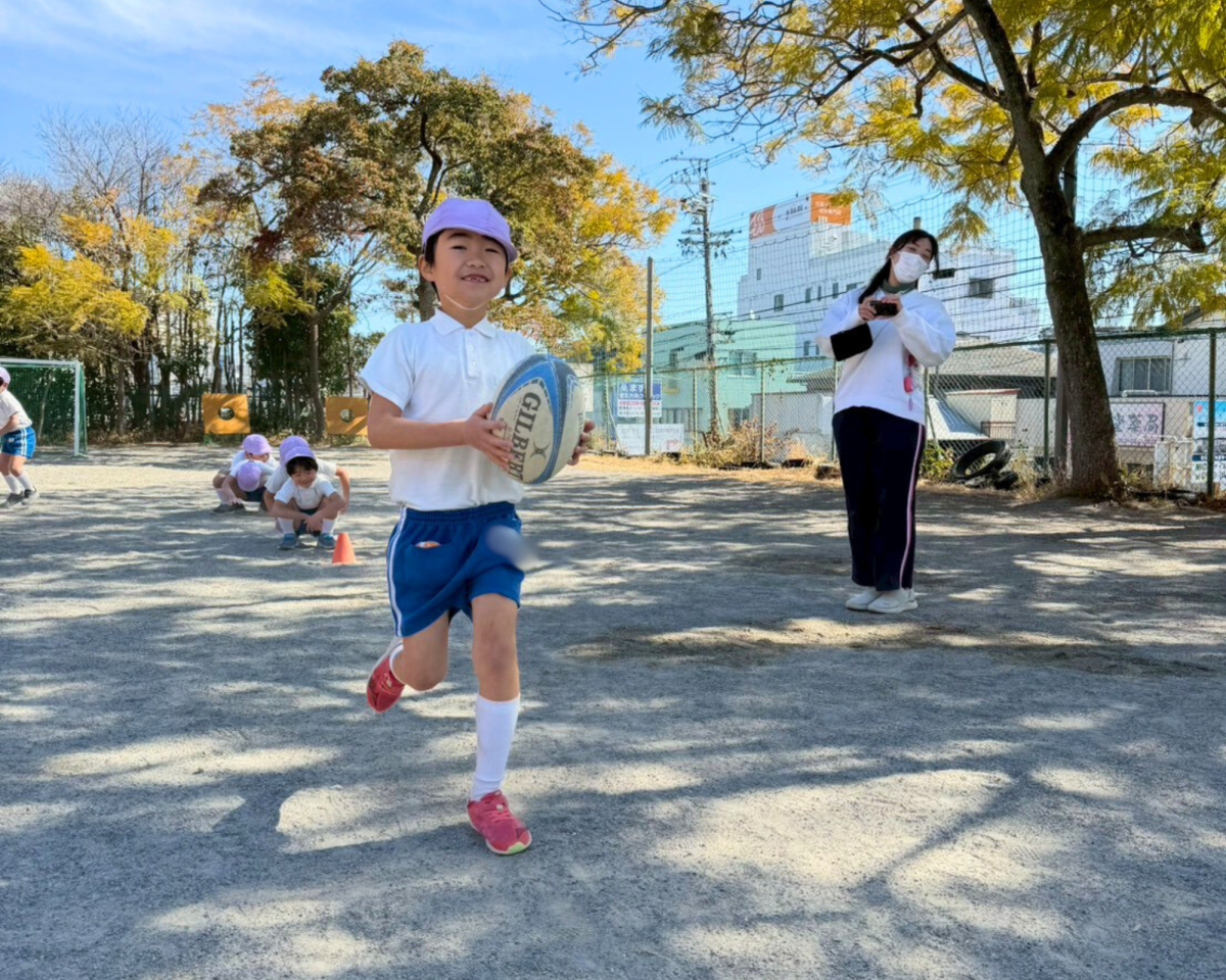 ほとんどの子がラグビーを知ってくれていてびっくり!体験では走ったり転がしたりぶつかったりラグビーの色んな技にチャレンジできました!よく頑張りました‼