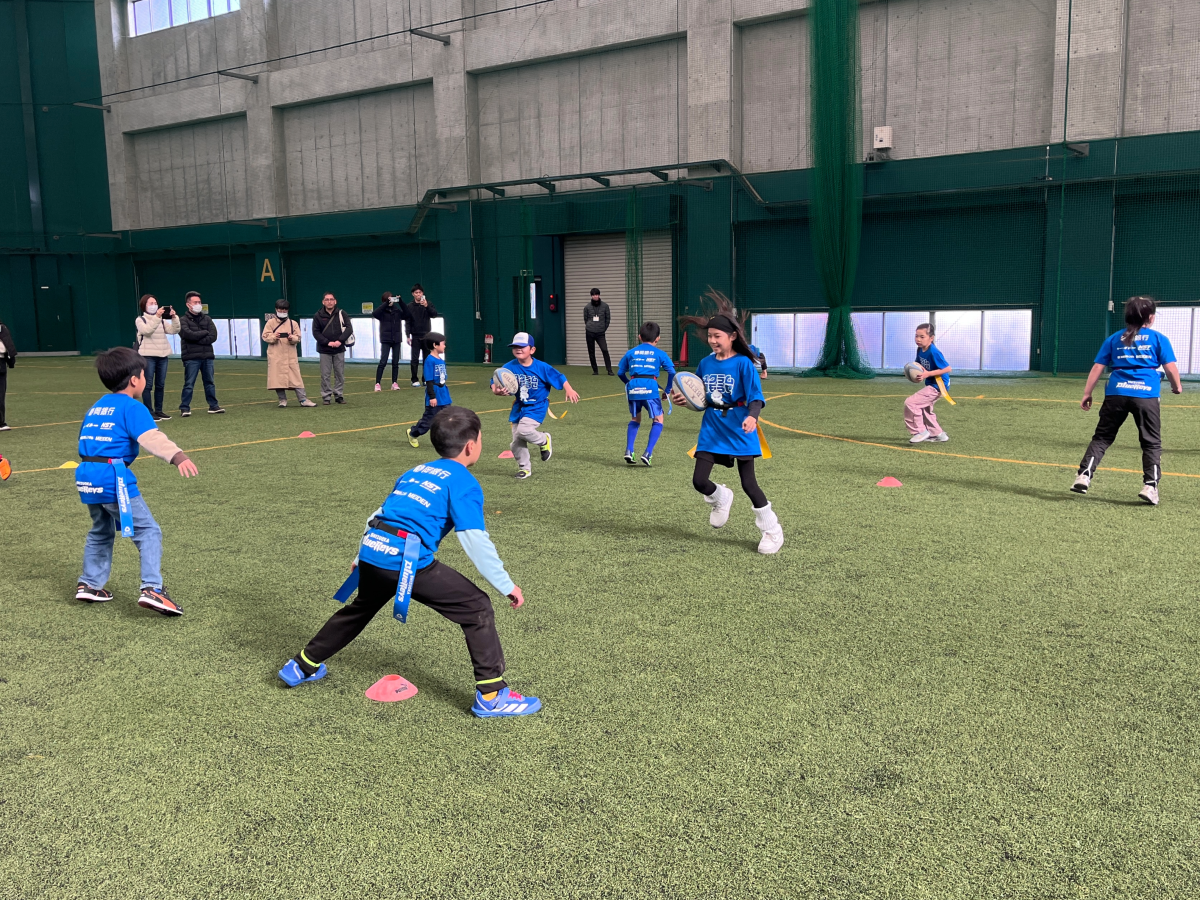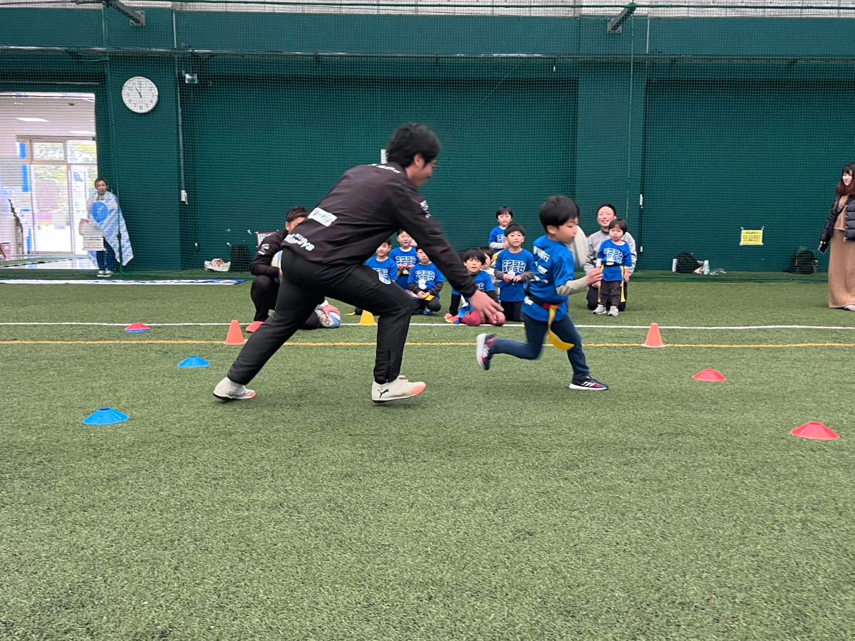 午後の部では、ボールを持って走ることに加え、チームで協力してパス回しやタグ取りゲームなどにチャレンジ。相手のことを考えて優しいパスをすることや、ラグビーの精神「ひとりはみんなのために、みんなはひとりのために~One for ALL, ALL for One~」を学びながら楽しく体験することができました。
