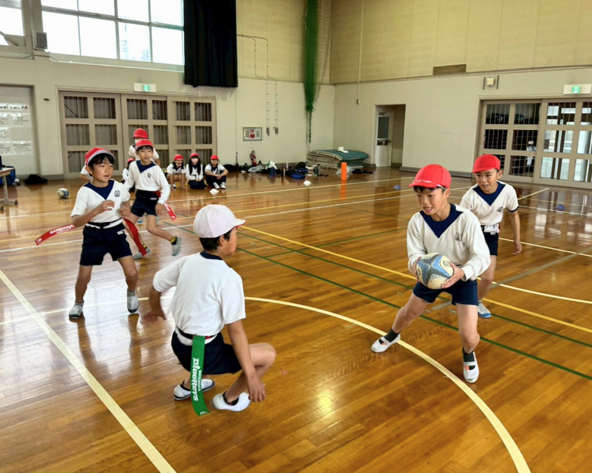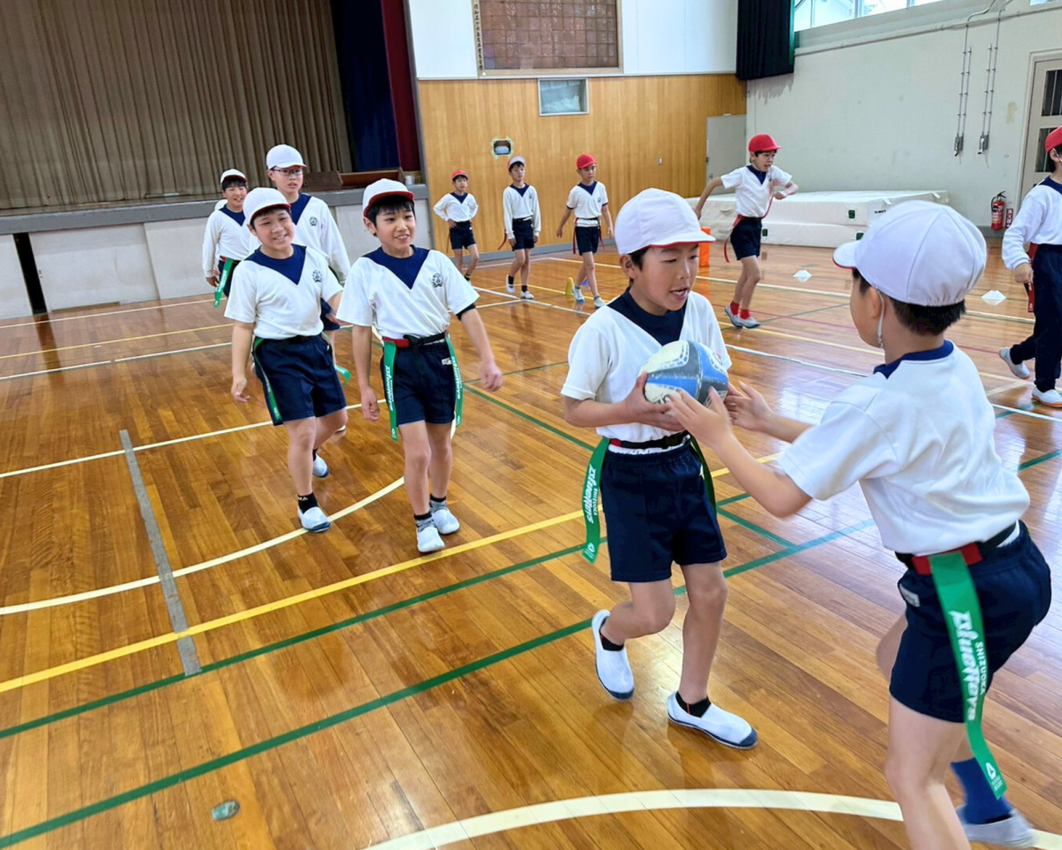 初めてのタグラグビーにチャレンジ!パスでは優しいかけ声や励ます声があり、思いやりとクラスの絆を感じました!明日の試合もチームワークと思いやりを大事にしてチャレンジしよう!!