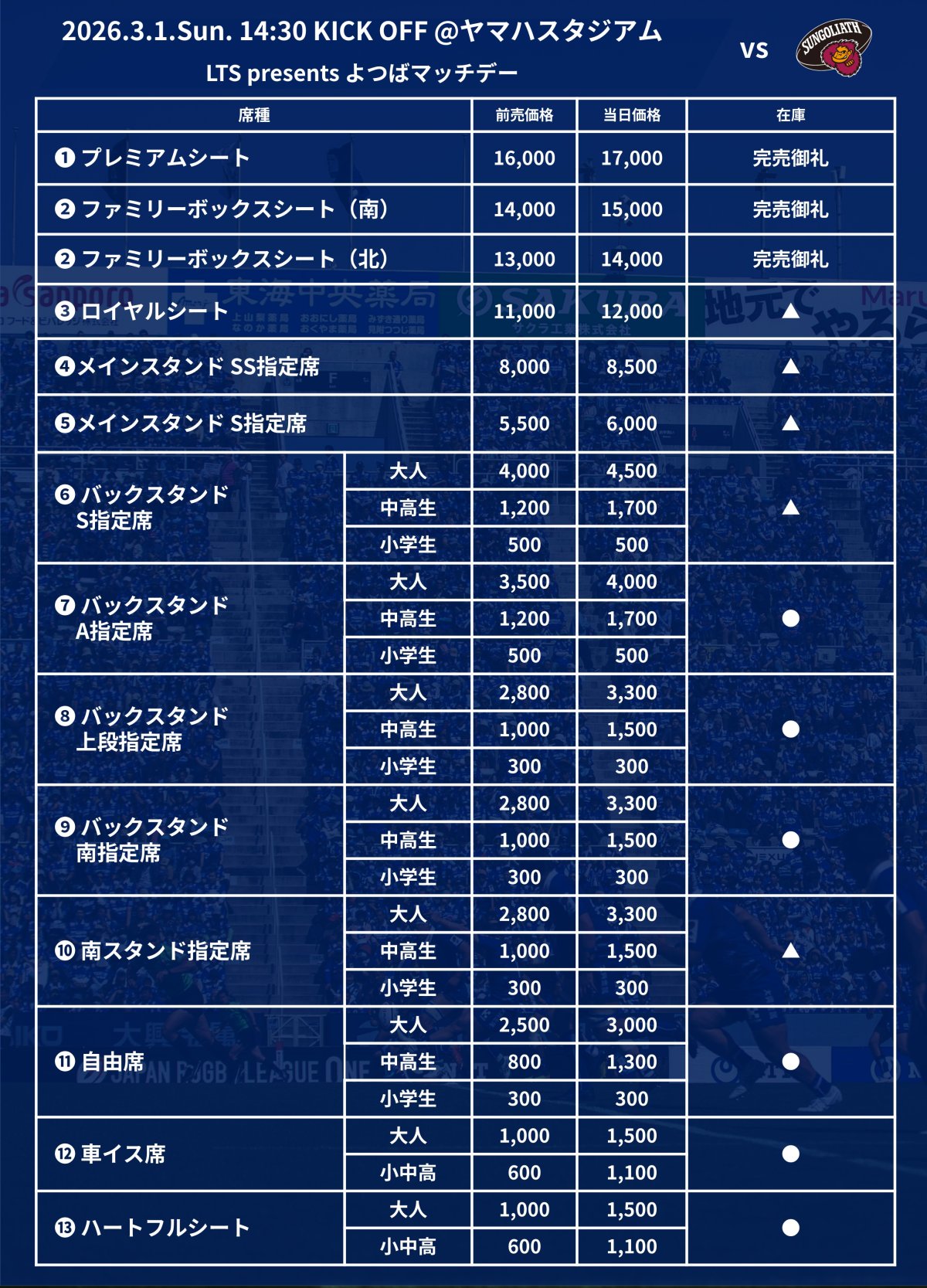 3/1(日)東京サントリーサンゴリアス戦の当日券販売について
