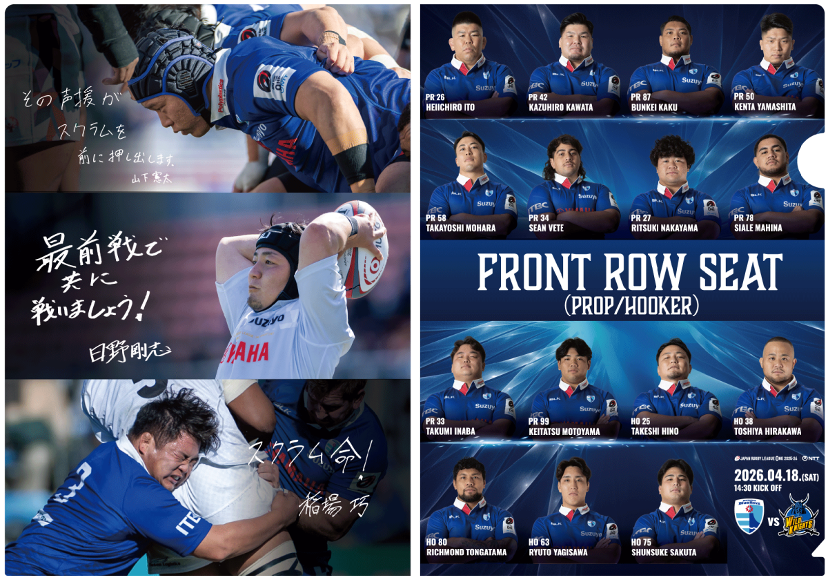 スタンド席とは異なる臨場感をピッチレベルで体感できる特別シートです。中央エリアを「フッカー」、両サイドを「プロップ」と名付け、ピッチレベルでの迫力ある観戦体験をお楽しみいただけます!また、本シートをご購入の方には、フロントローの選手をデザインしたオリジナルクリアファイルをプレゼントいたします。