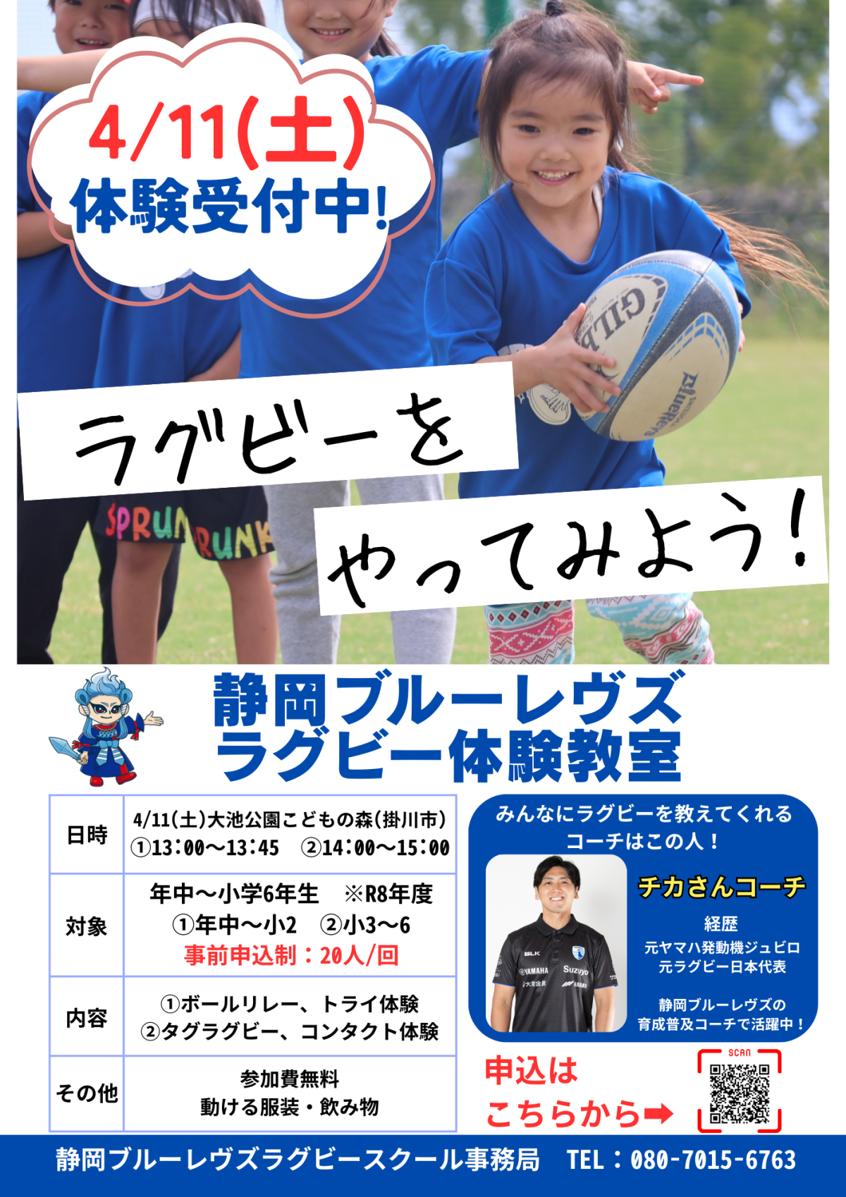 静岡ブルーレヴズではこの度、[春のラグビー体験会]と題し、4月4日(土)に浜松市、同11日(土)に掛川市で初心者・未経験者大歓迎のラグビー体験会を実施いたします。新たに習い事を始めることの多いこの季節、参加は無料ですので、まずはお気軽にご参加ください。