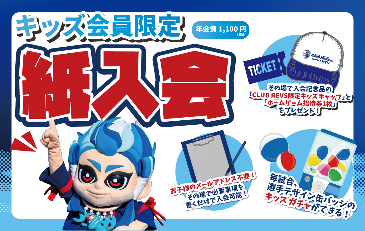 キッズ会員・親子会員のお子様を対象に<CLUB REVS限定キッズガチャ>を実施いたします。デジタル会員証(マイページ)もしくはカード型会員証(試合会場にて紙入会でキッズ会員に入会された方)をスタッフへご提示いただくと、ホームゲームで毎試合1回まで参加いただけます。