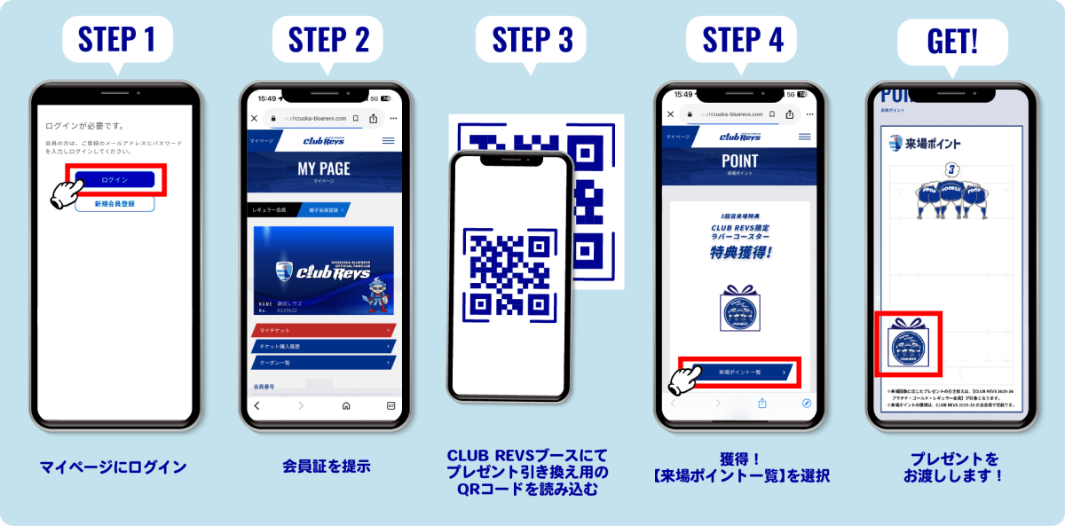 試合当日に、マッチデープログラムおよびスタジアム内に掲示している来場ポイント獲得用QRコードを読み込み、来場ポイントを獲得してからCLUB REVSブースへお越しください。