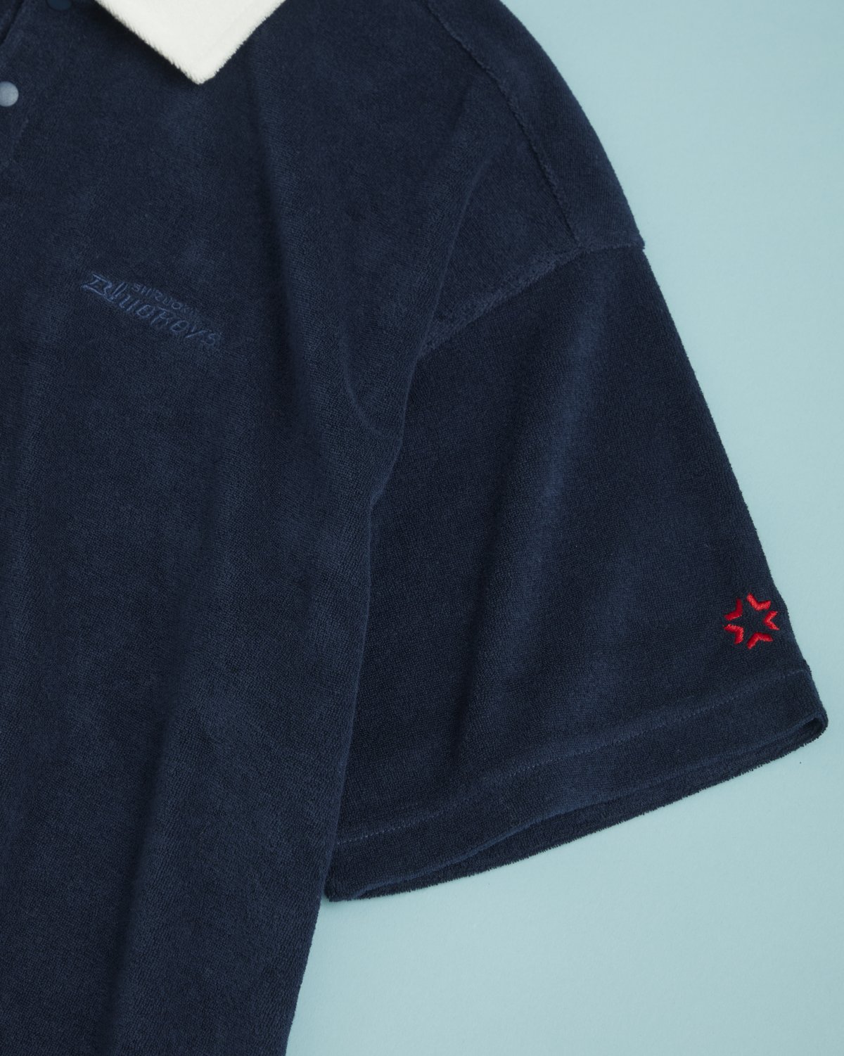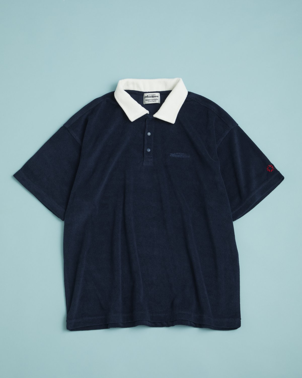 肌触りの良いパイル素材を使用し、柔らかな質感を活かしながら、程よく肩を落としたリラックス感のあるサイズバランスに仕上げました。深みのあるネイビーをベースに、レヴズの伝統を感じさせるホワイトカラーの襟を組み合わせ、上品で洗練された印象に。首元には着脱のしやすいスナップボタンを採用し、胸元には同色でロゴ刺繍を施すことで、主張しすぎないミニマルなアクセントを添えています。スポーティーな要素を持ちながらも、落ち着いた佇まいが魅力の一着です。