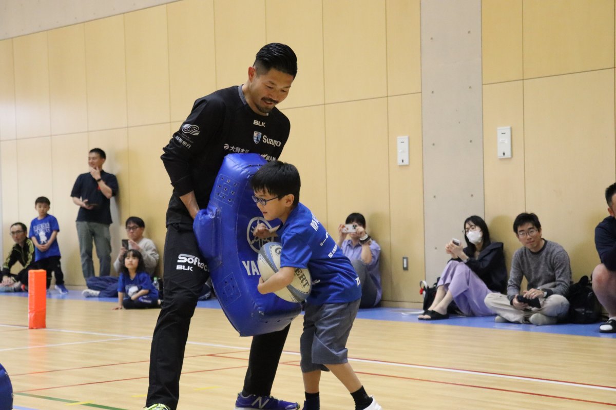 「本日はたくさんの子どもたちが参加してくださり、とても賑やかなイベントとなりました。初めてラグビーする子も多く、最初は緊張と不安もあったと思いますが、体験が始まれば「笑顔」でラグビーを楽しむ様子も見られ、ふじさんも嬉しかったです。今回の体験で「ラグビーって面白い!」と感じてもらえていたら嬉しいです。また、我々コーチ陣も皆さんとラグビーができ、楽しい時間を過ごすことができました。参加してくださった子どもたち及び保護者の皆さまには感謝申し上げます。今回の体験でラグビーをやってみたい!と思った子は、是非スクールにも遊びに来てください。引き続き静岡ブルーレヴズへの熱い声援よろしくお願いいたします」
