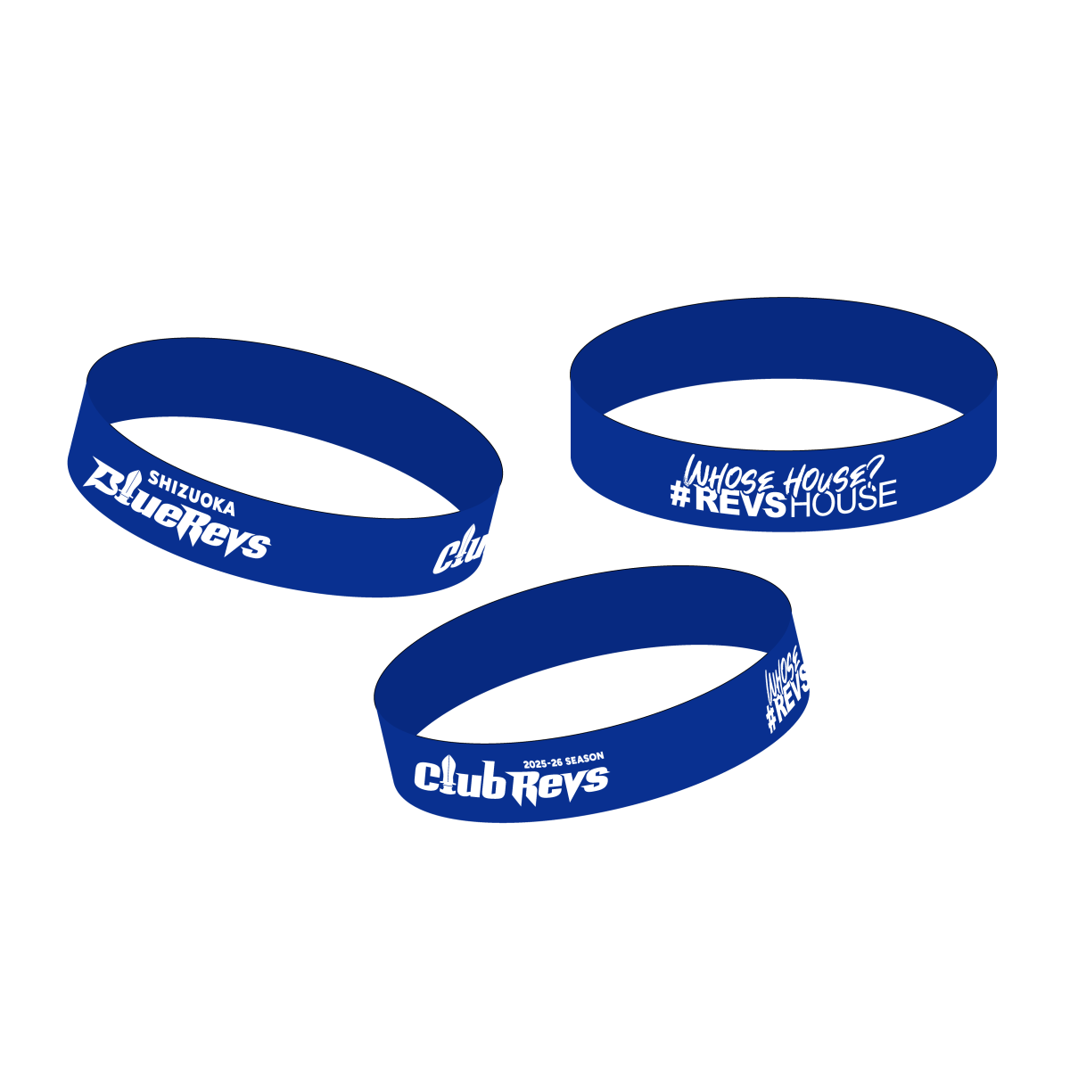 ※1つのリストバンドに<SHIZUOKA BlueRevs><Club Revs><WHOSE HOUSE? #REVSHOUSE>の3つのロゴが均等に配置されます