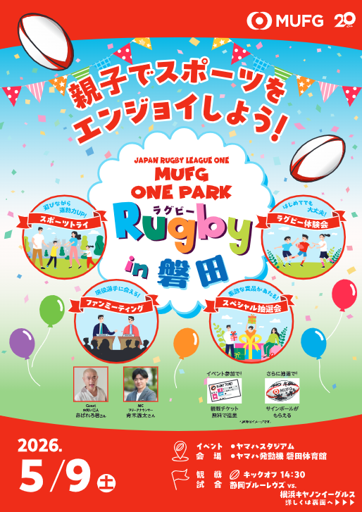 今シーズンのリーグ最終戦となる5月9日(土)のNTTジャパンラグビー リーグワン2025-26 DIVISION 1 第18節 大興金属 presents マッチデー 横浜キヤノンイーグルス戦(ヤマハスタジアム/14:30キックオフ)において、昨年に引き続き、MUFG ONE PARK in 磐田を開催します。MUFG ONE PARK in 磐田は、JAPAN RUGBY LEAGUE ONEのプリンシパルパートナーである三菱UFJフィナンシャル・グループが主催し、ラグビー体験や走る・投げるの運動教室、試合観戦をセットにしたイベントとなります。